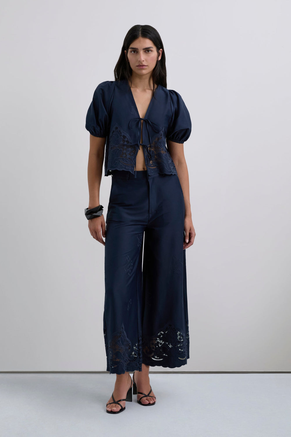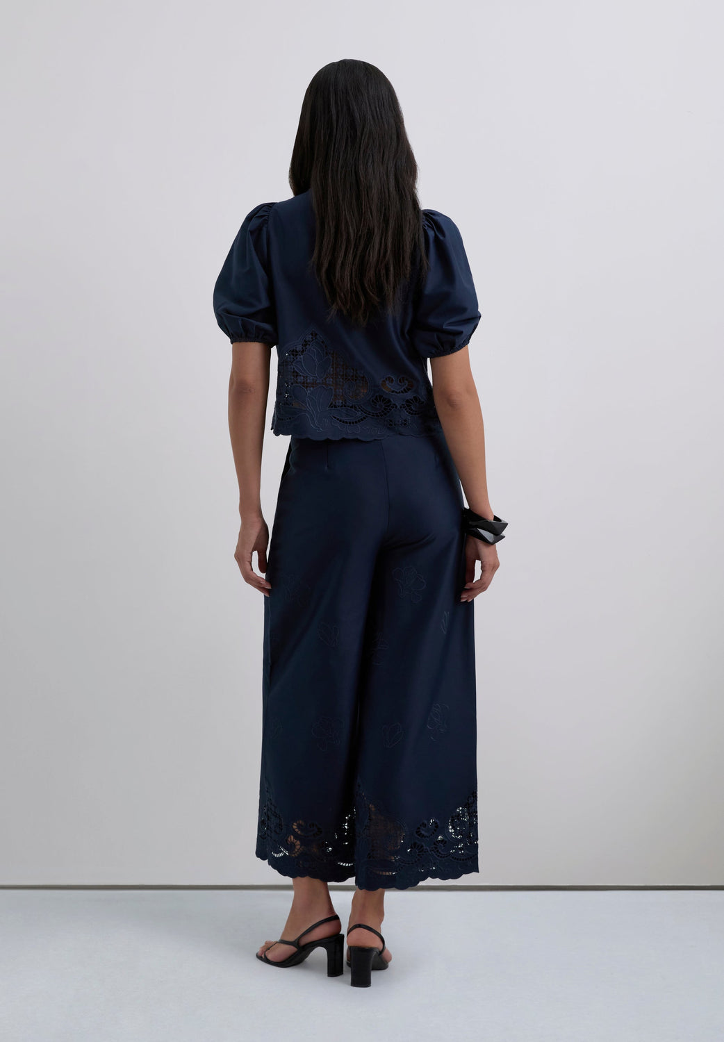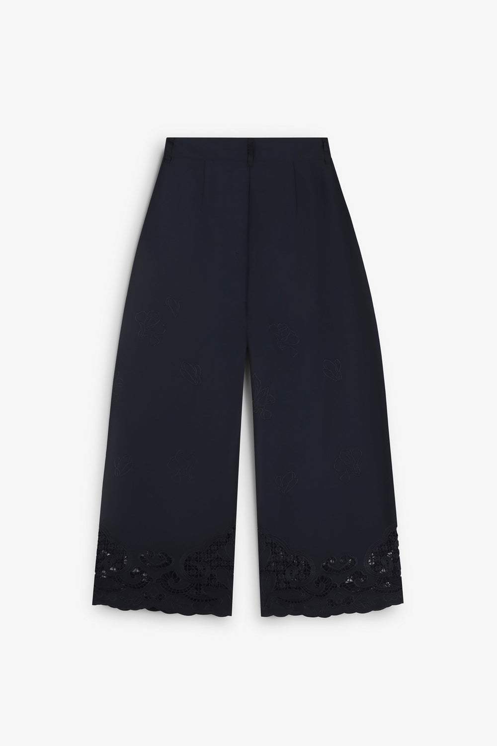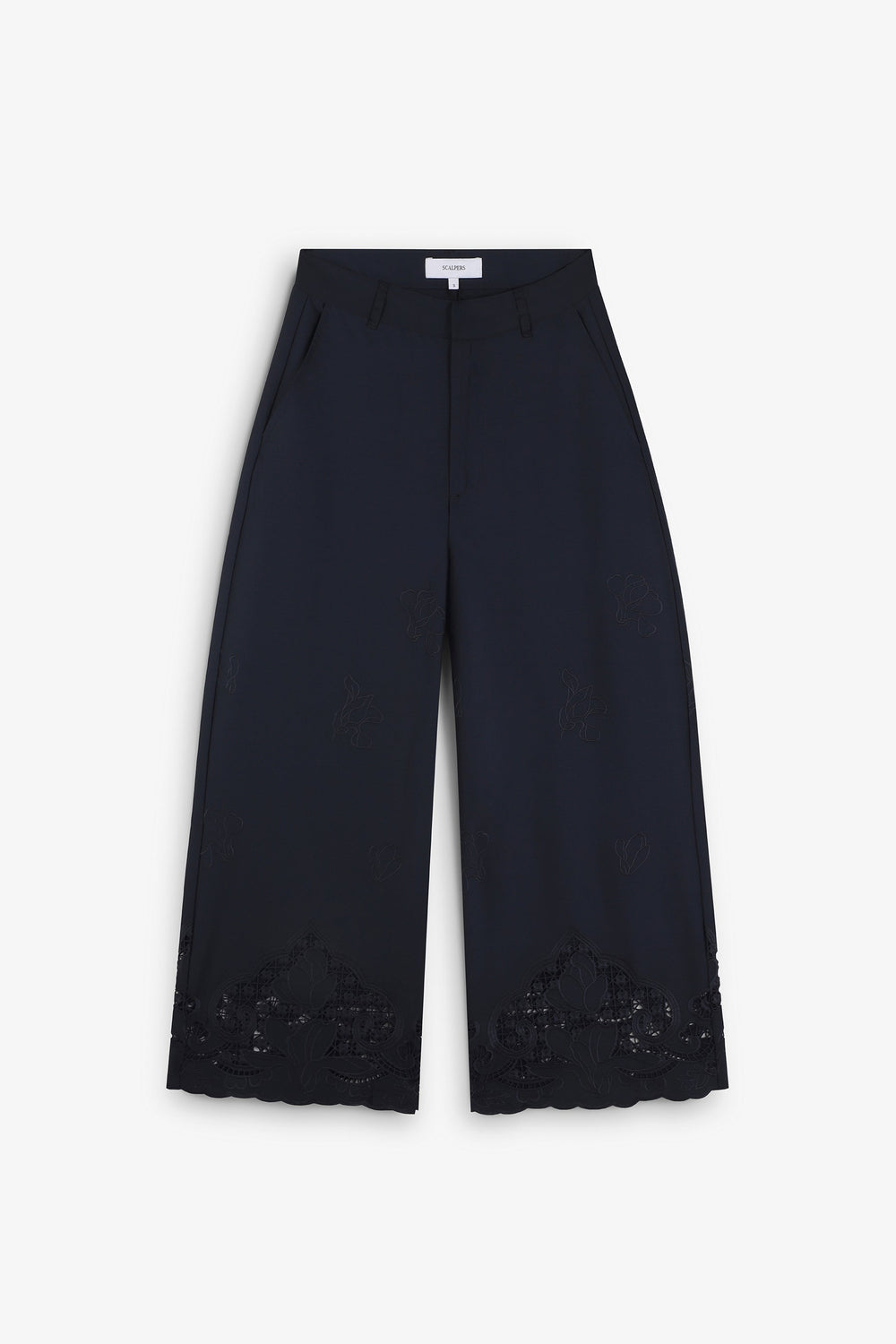 Long culottes. Openwork embroidery all over the leg, especially around the hem. Front slant pockets. Slightly flared.