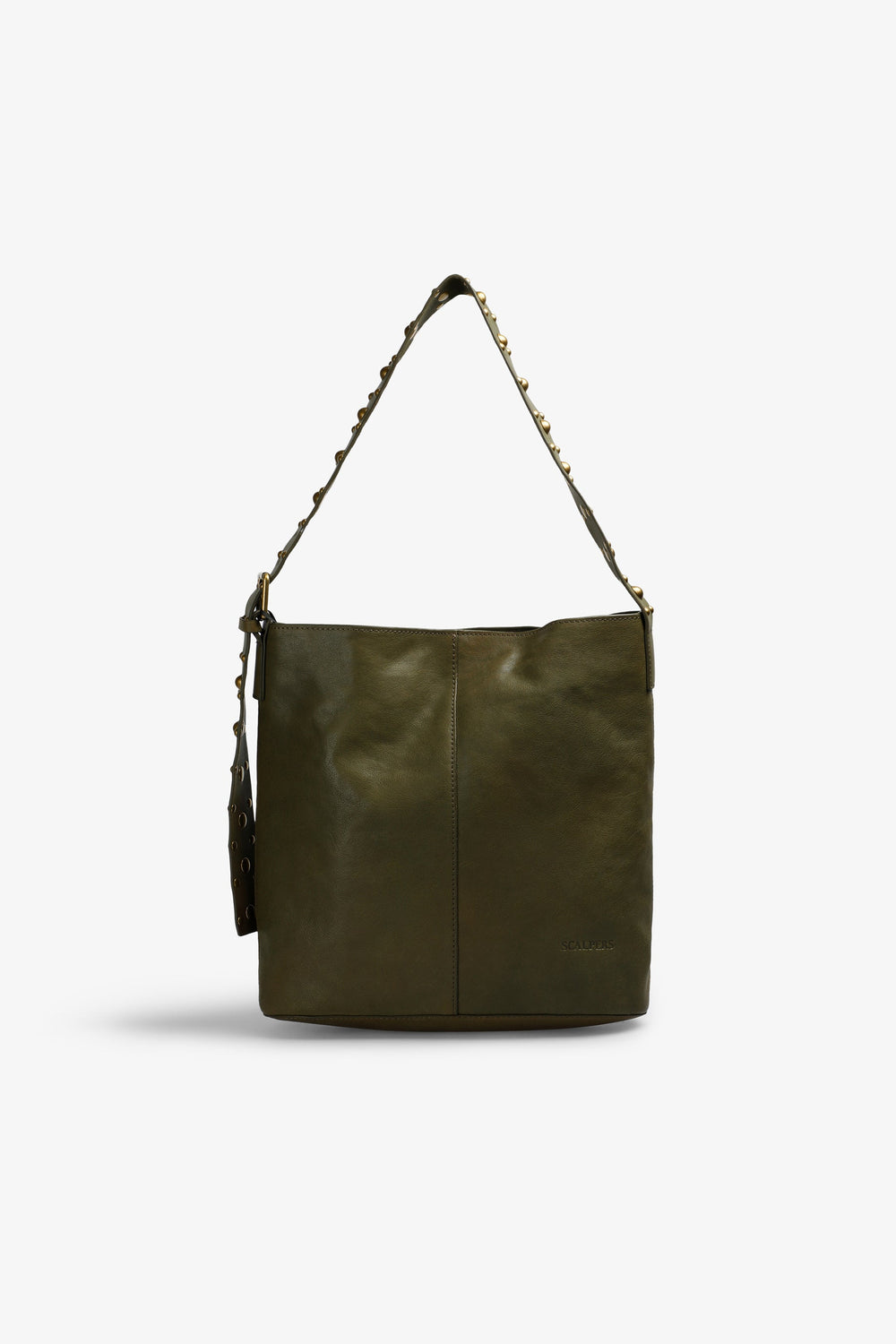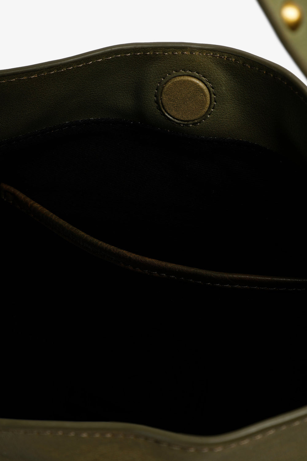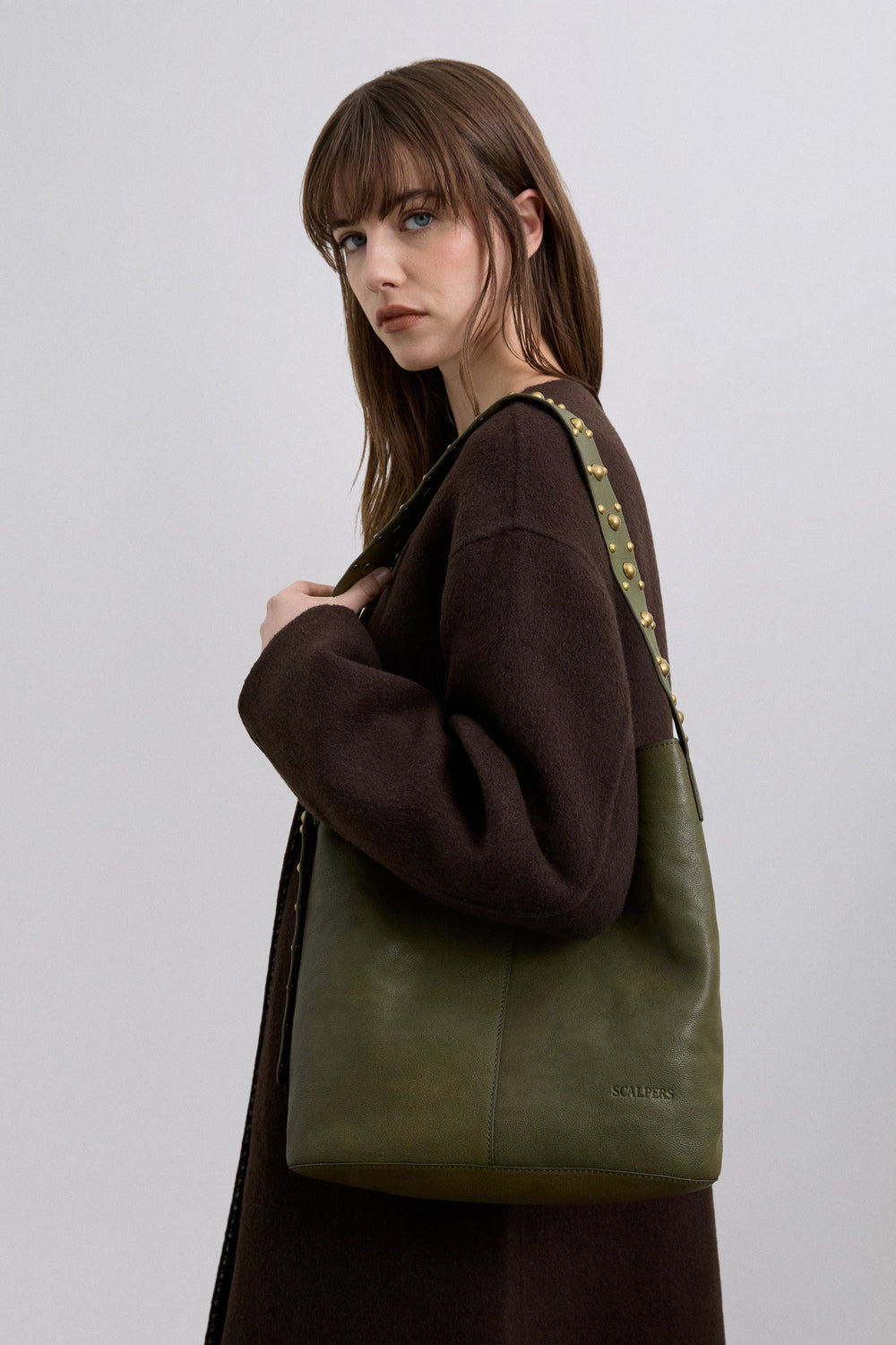 Tote bag in 100% leather. Adjustable shoulder strap. Stud detail. Inner pocket. Tonal embroidered logo. Magnetic button closure.