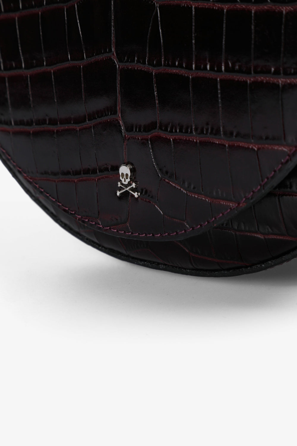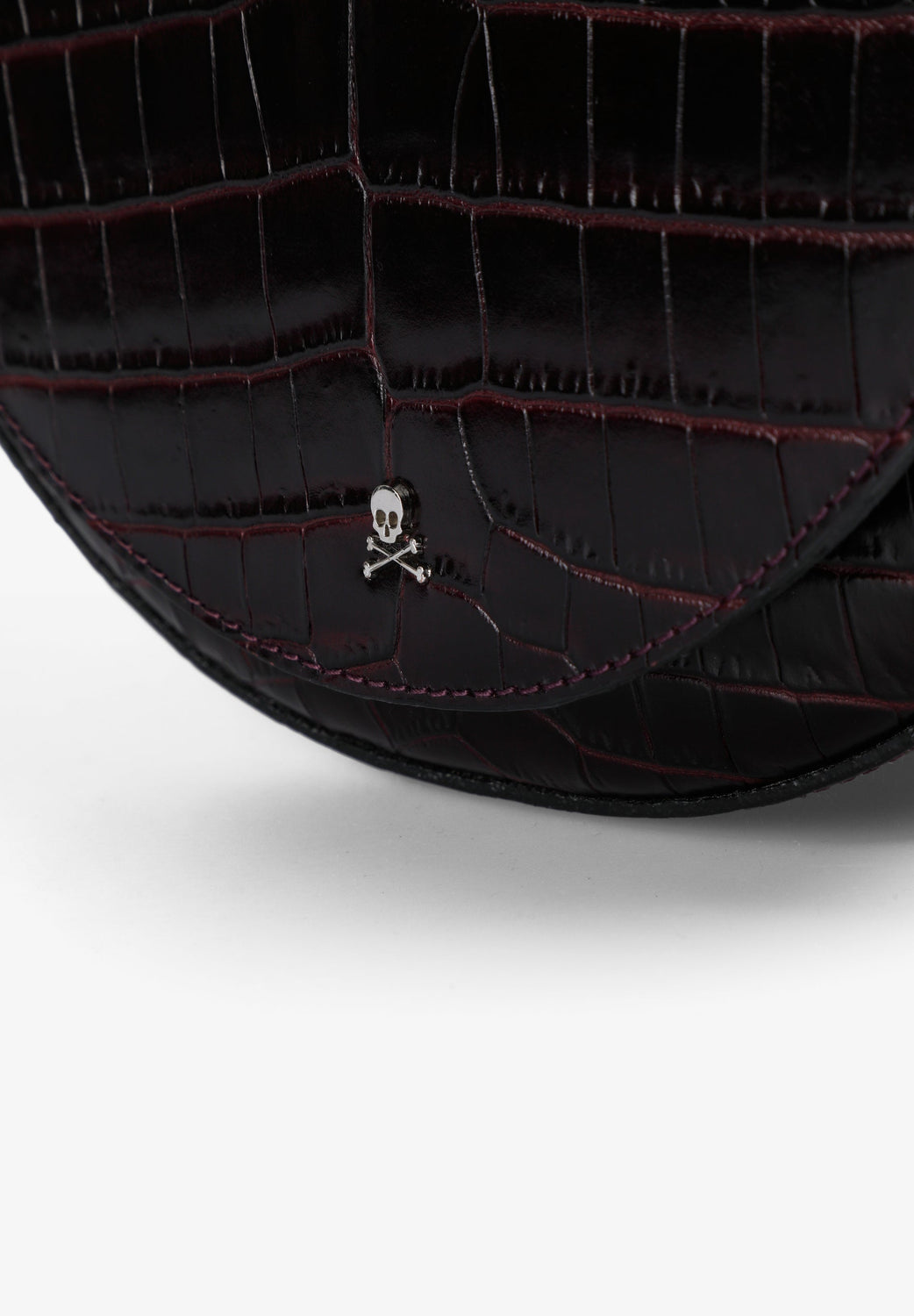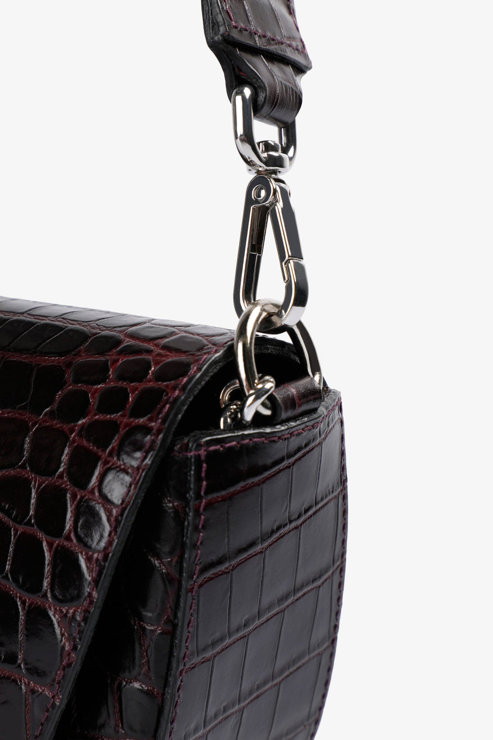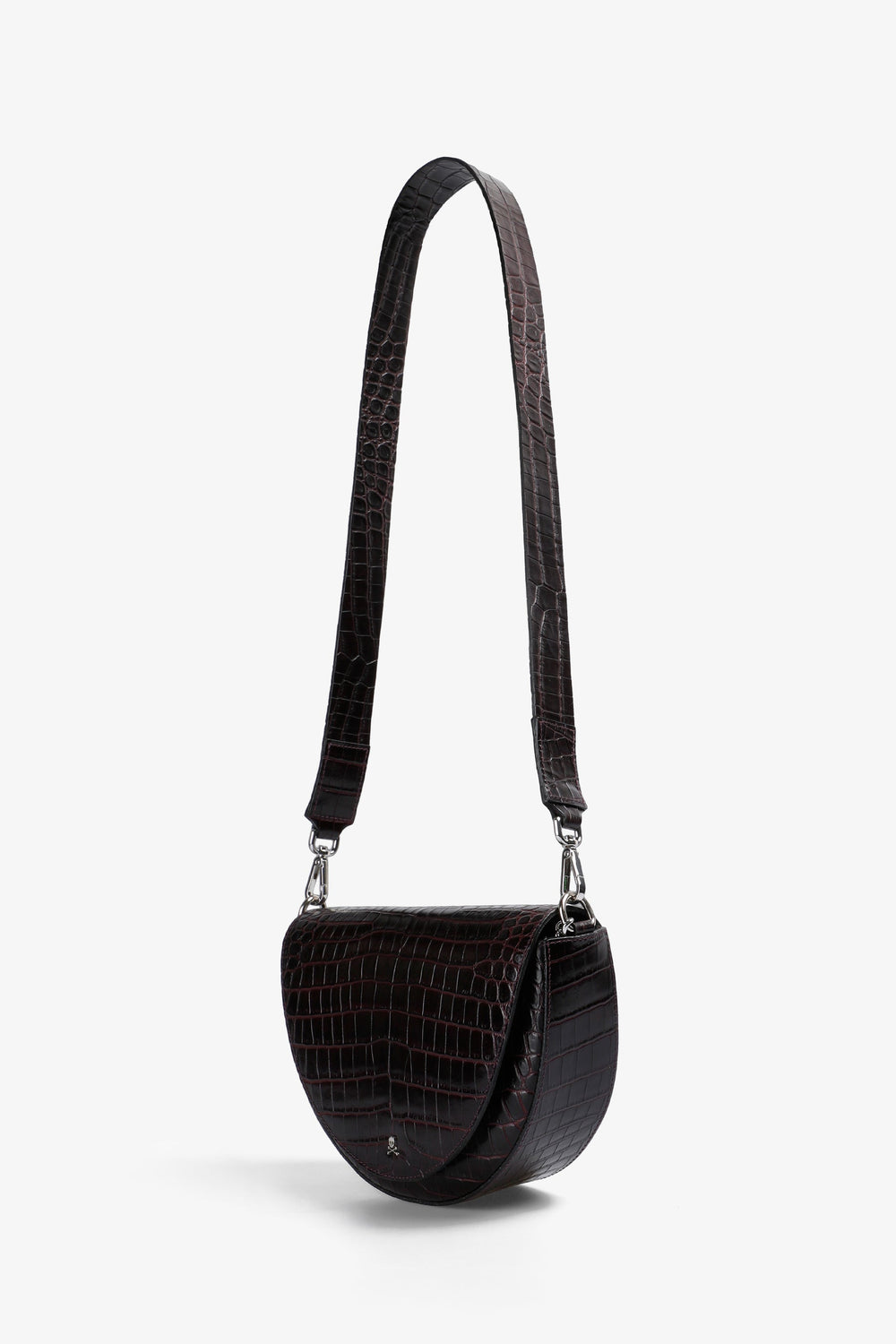 Engraved leather bag. Made of 100% leather. Magnetic closure with flap. Long detachable strap. Chain detail as short handle