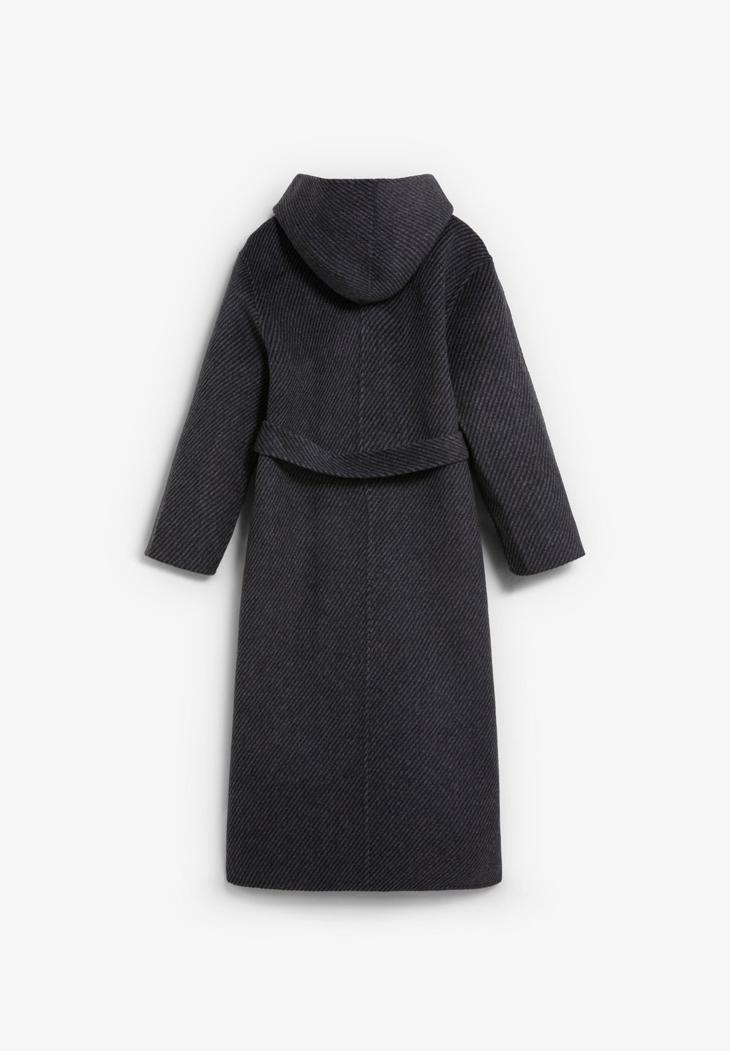 Long hooded coat made of a wool blend. Diagonal stripe on exterior. Two front pockets. Belt fastening.
