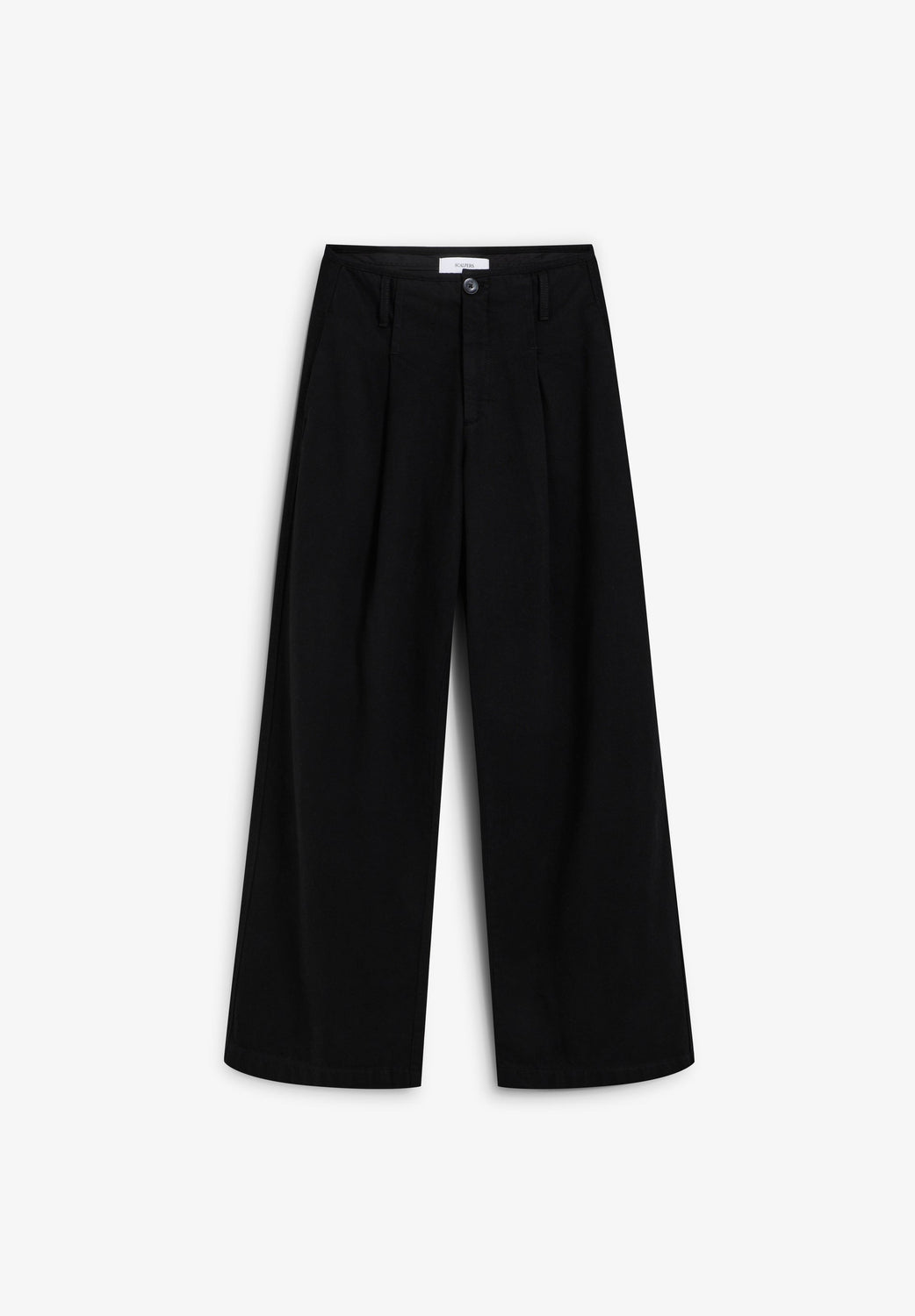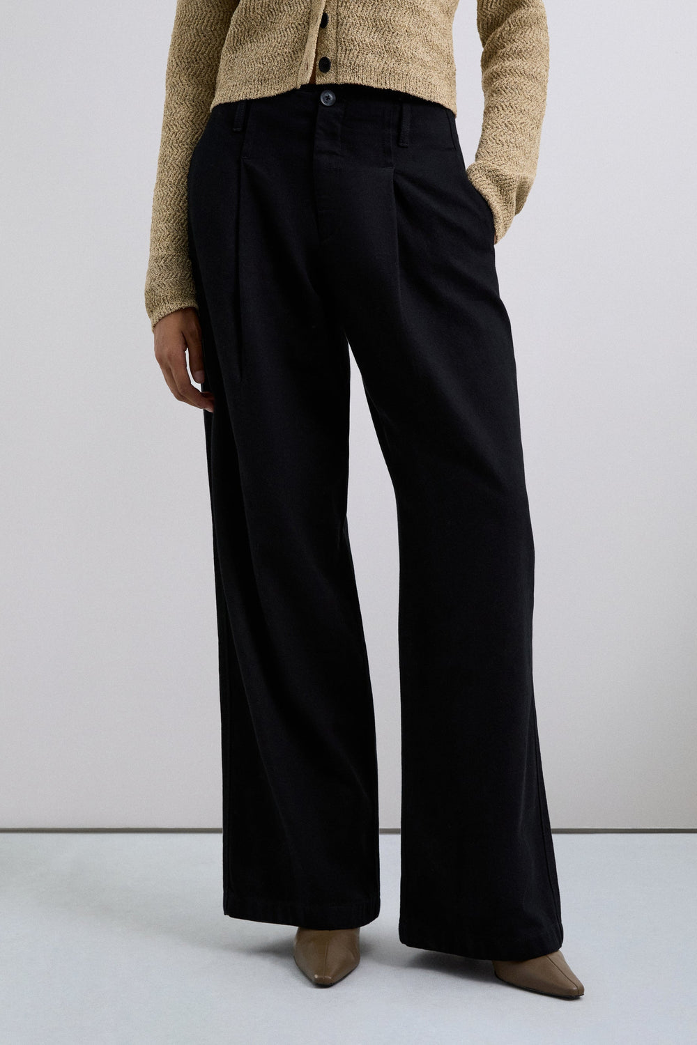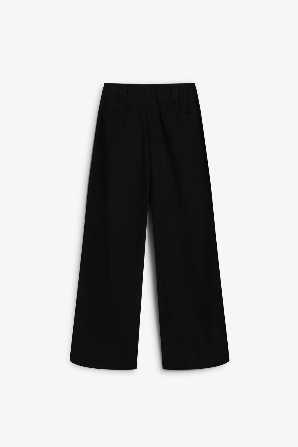 Trousers made of 100% cotton. Wide-leg trousers, designed with a wide, loose-fit from hip to ankle. Button and zip fastening. Belt loops.