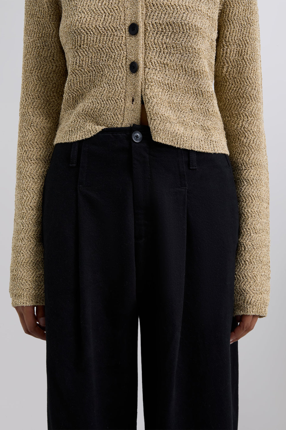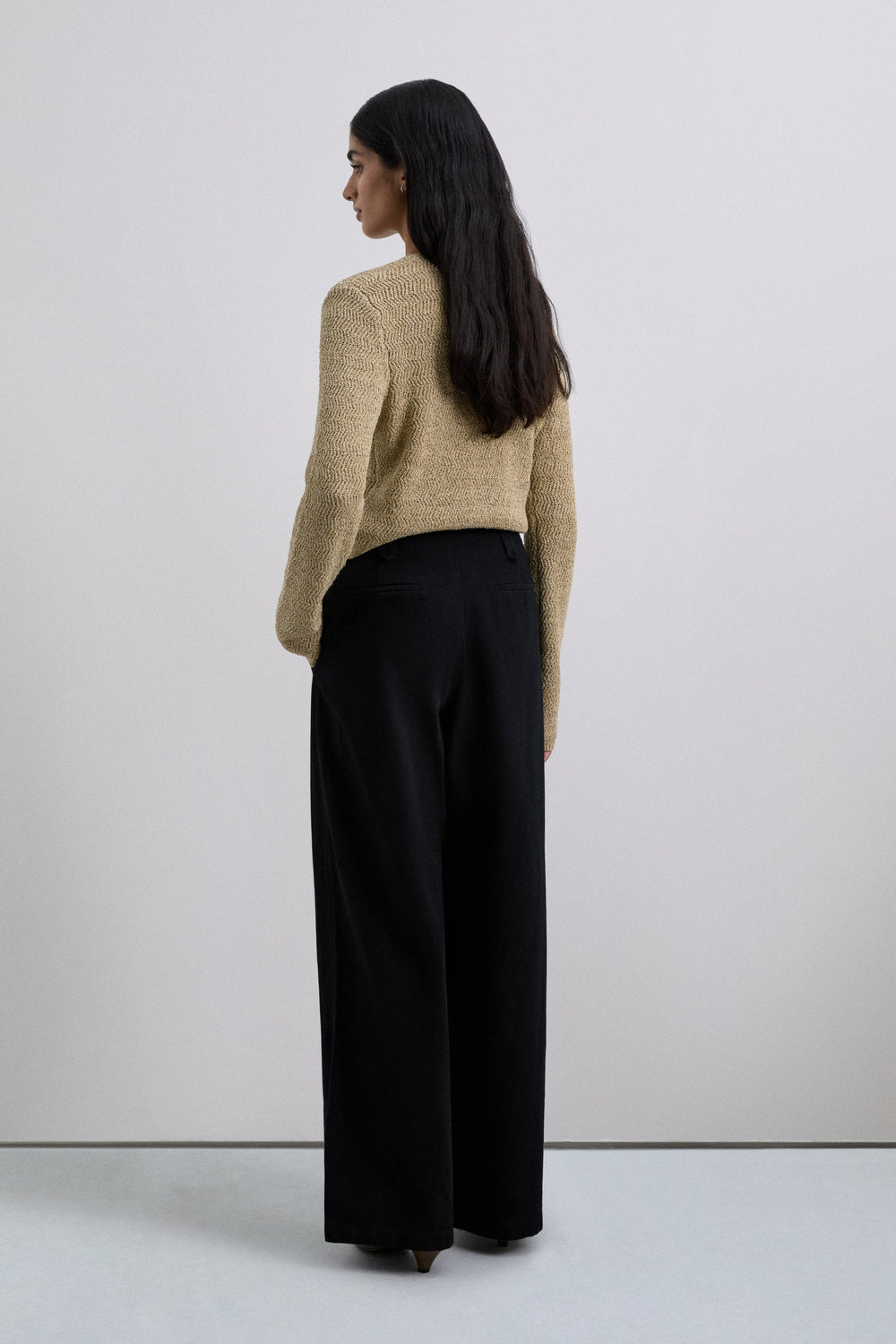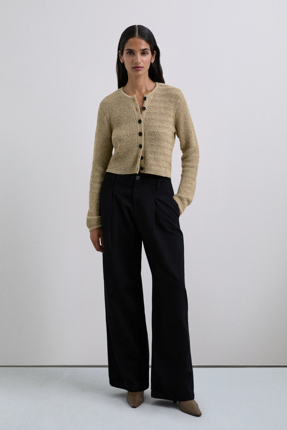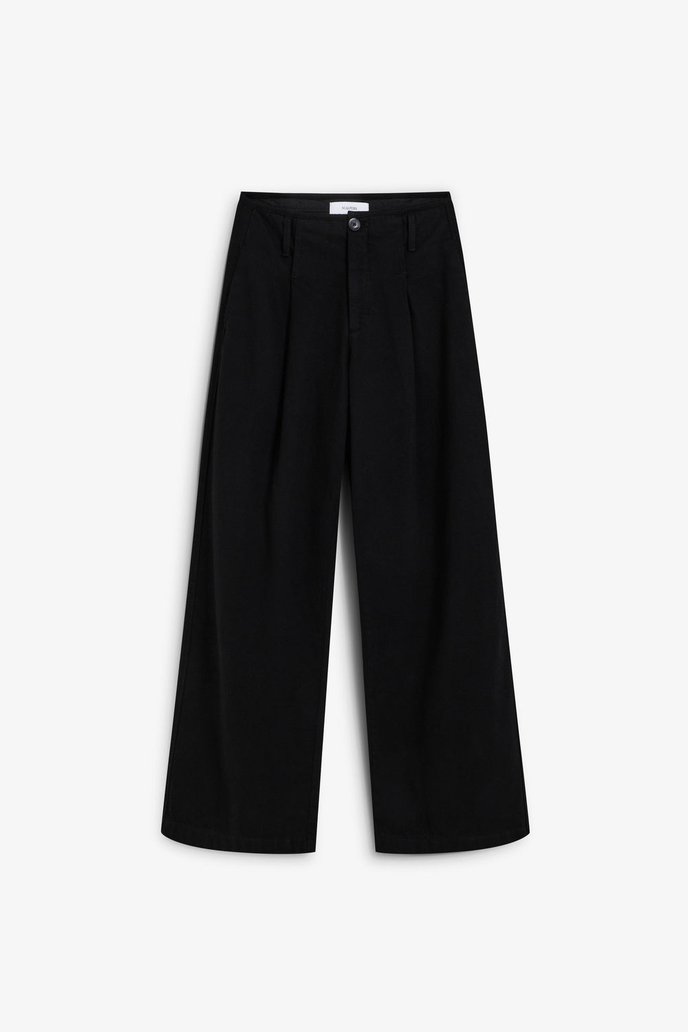 Trousers made of 100% cotton. Wide-leg trousers, designed with a wide, loose-fit from hip to ankle. Button and zip fastening. Belt loops.