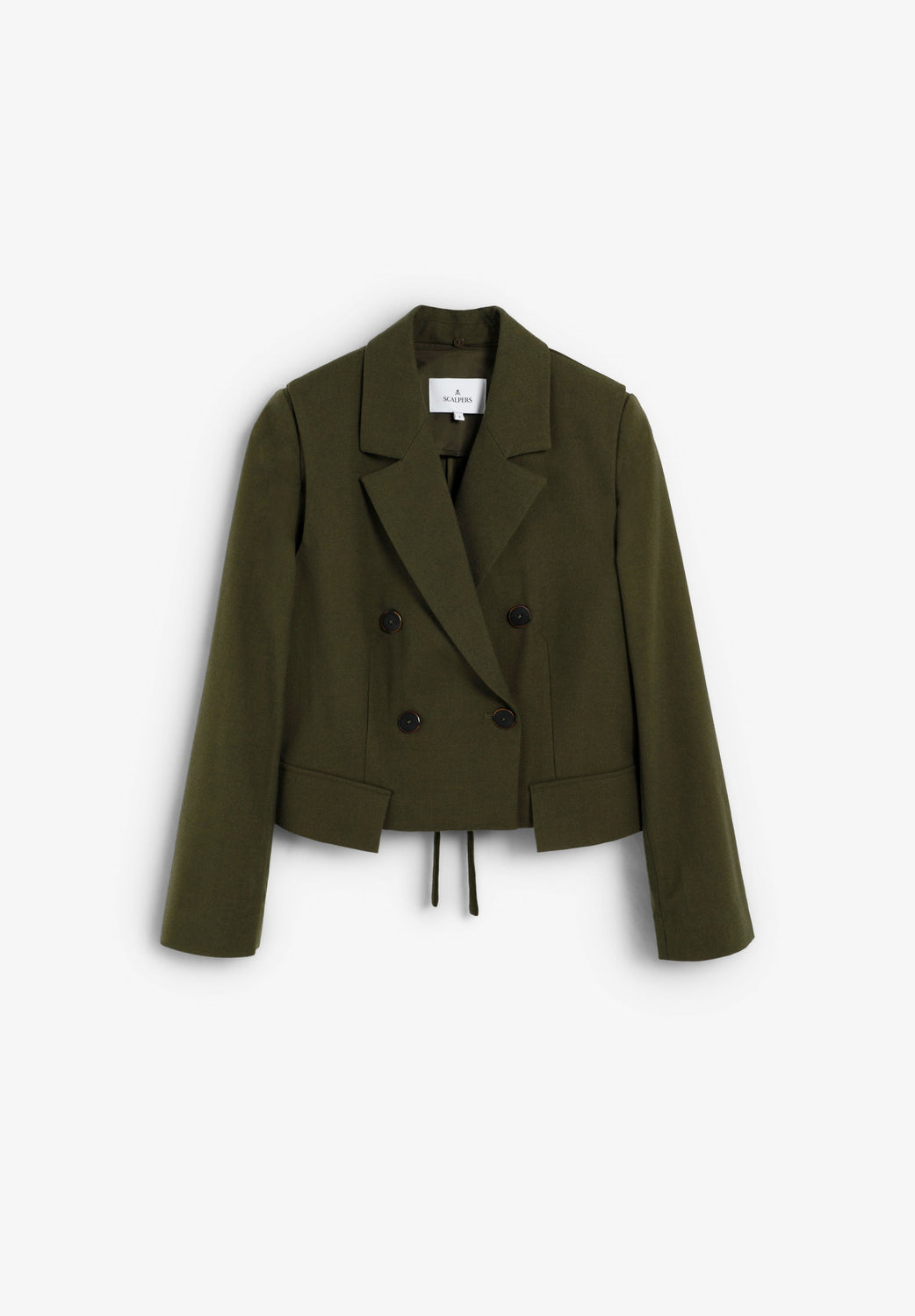 Blazer made of a viscose blend. Detachable into a waistcoat and a cropped jacket. Sleeveless waistcoat with lapel collar, button fastening and adjustable back. Cropped jacket, collar without lapel, long sleeves and chest welt pocket.