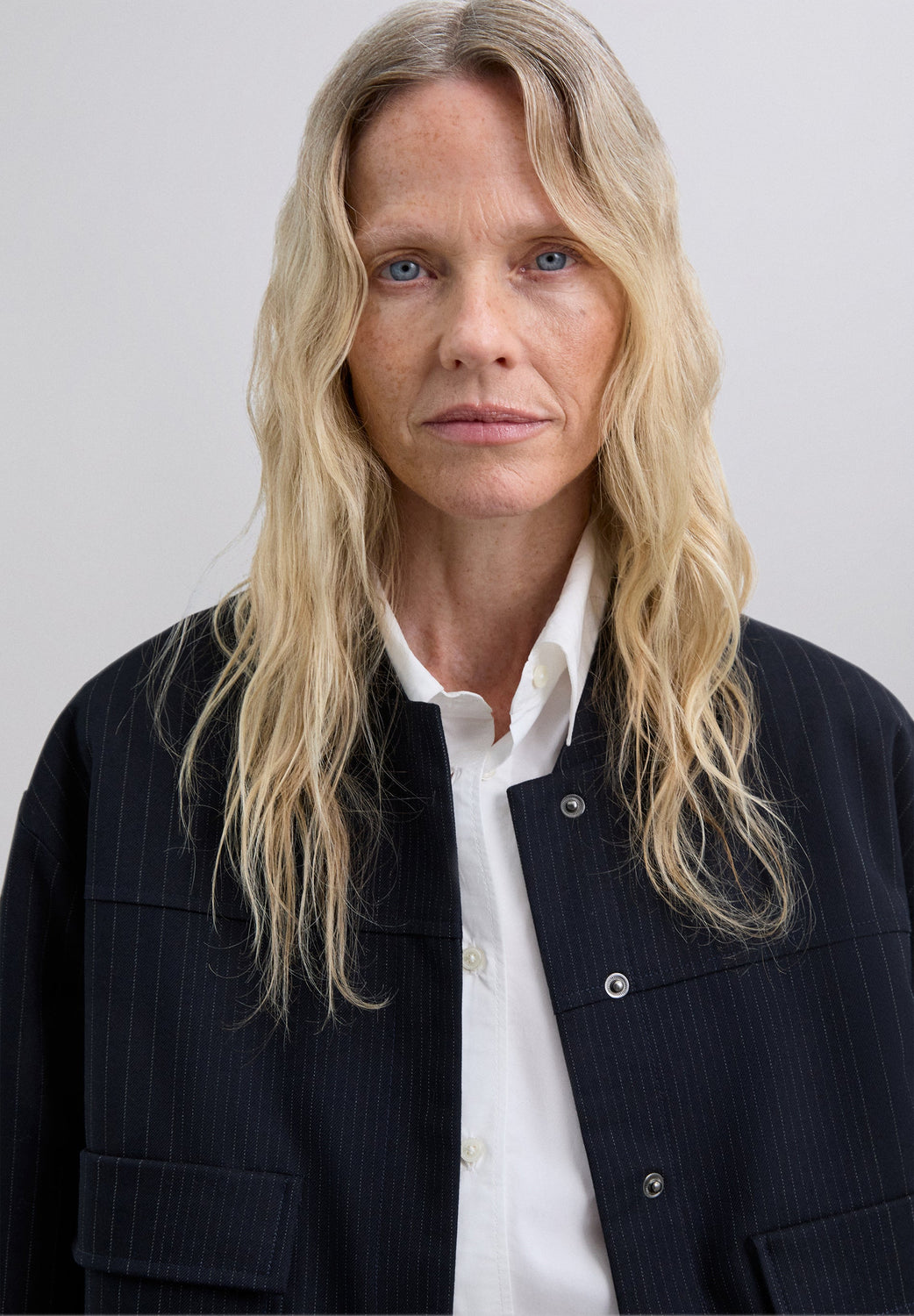 Pinstripe bomber jacket. Shirred stand-up collar. Long sleeves. Slightly stretchy waist. Front zip and button fastening. Two back pockets with flaps.