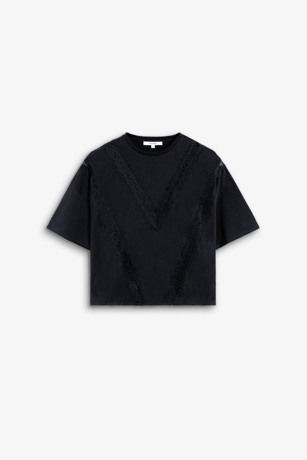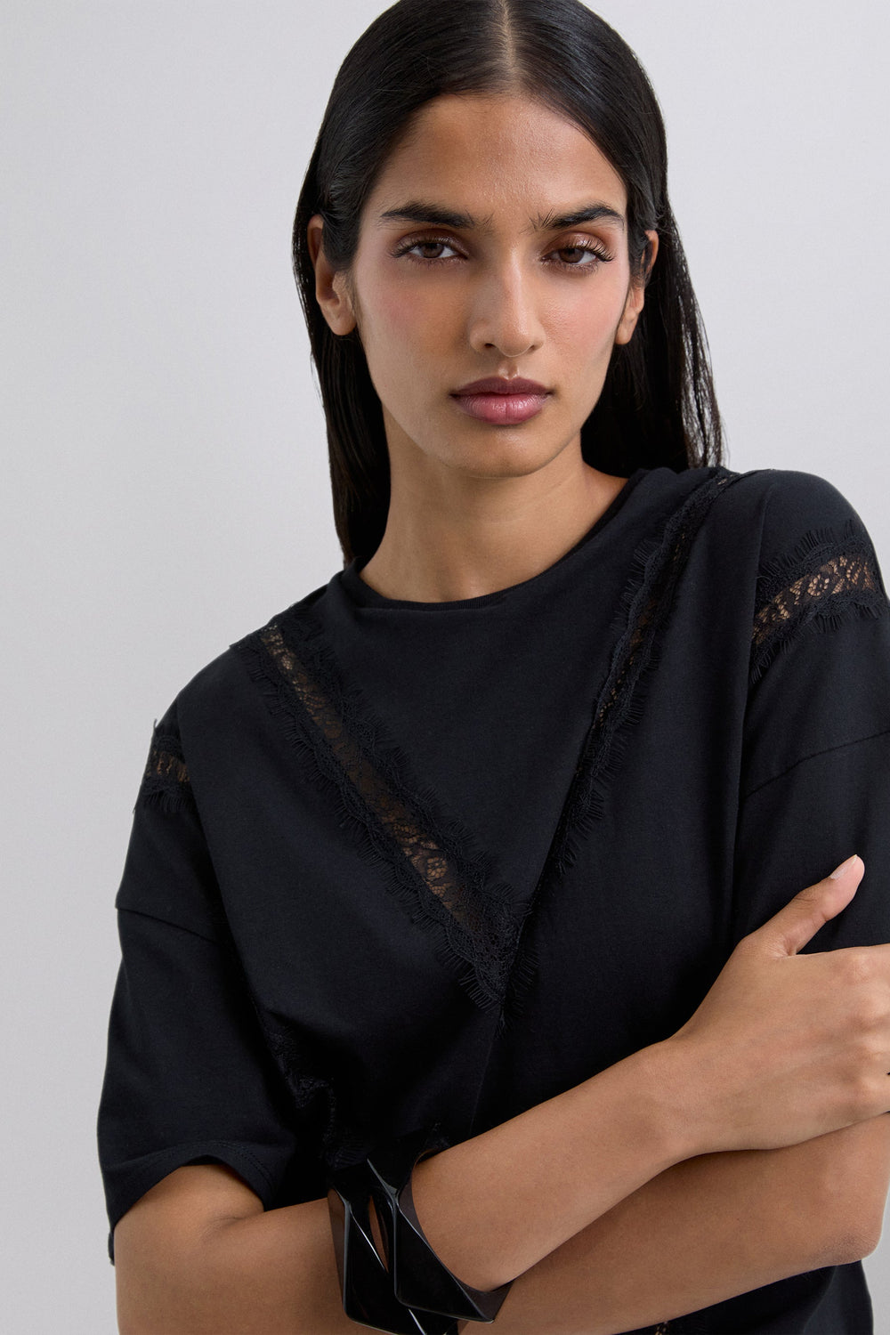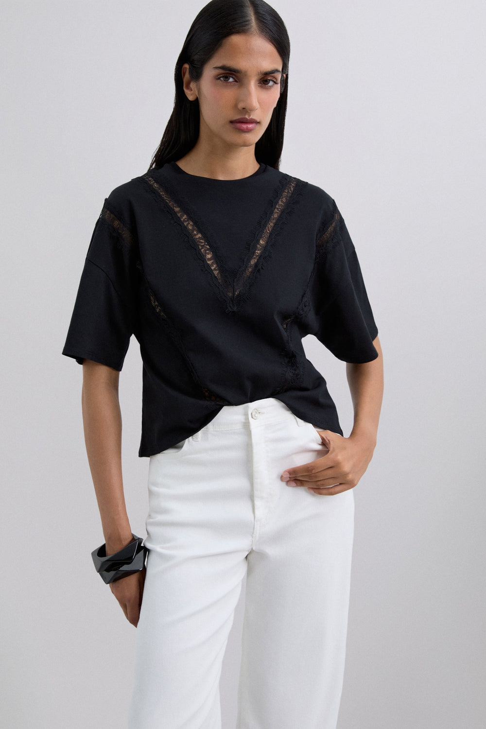 T-shirt made of 100% BCI cotton. Round neck and short sleeves. Lace detailing on front sleeves and at the front with V-neck detail.