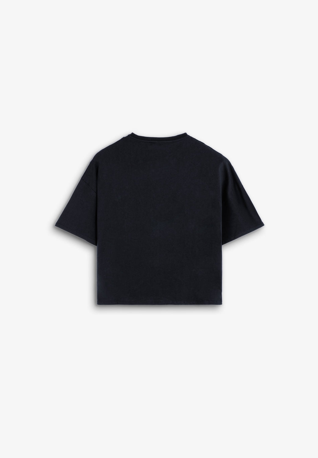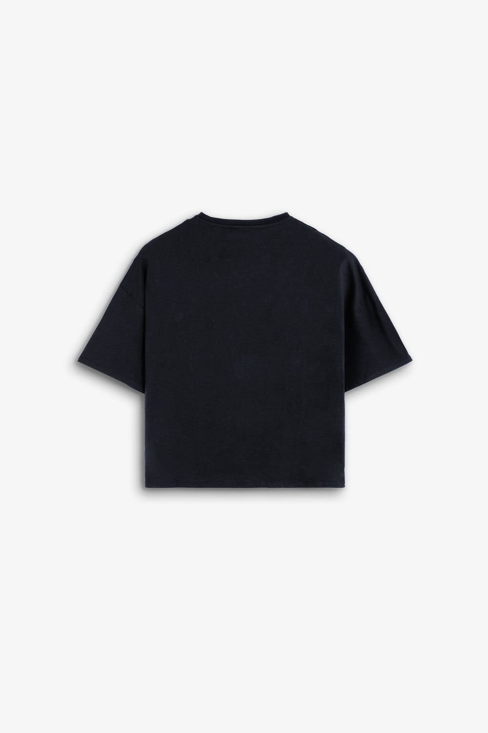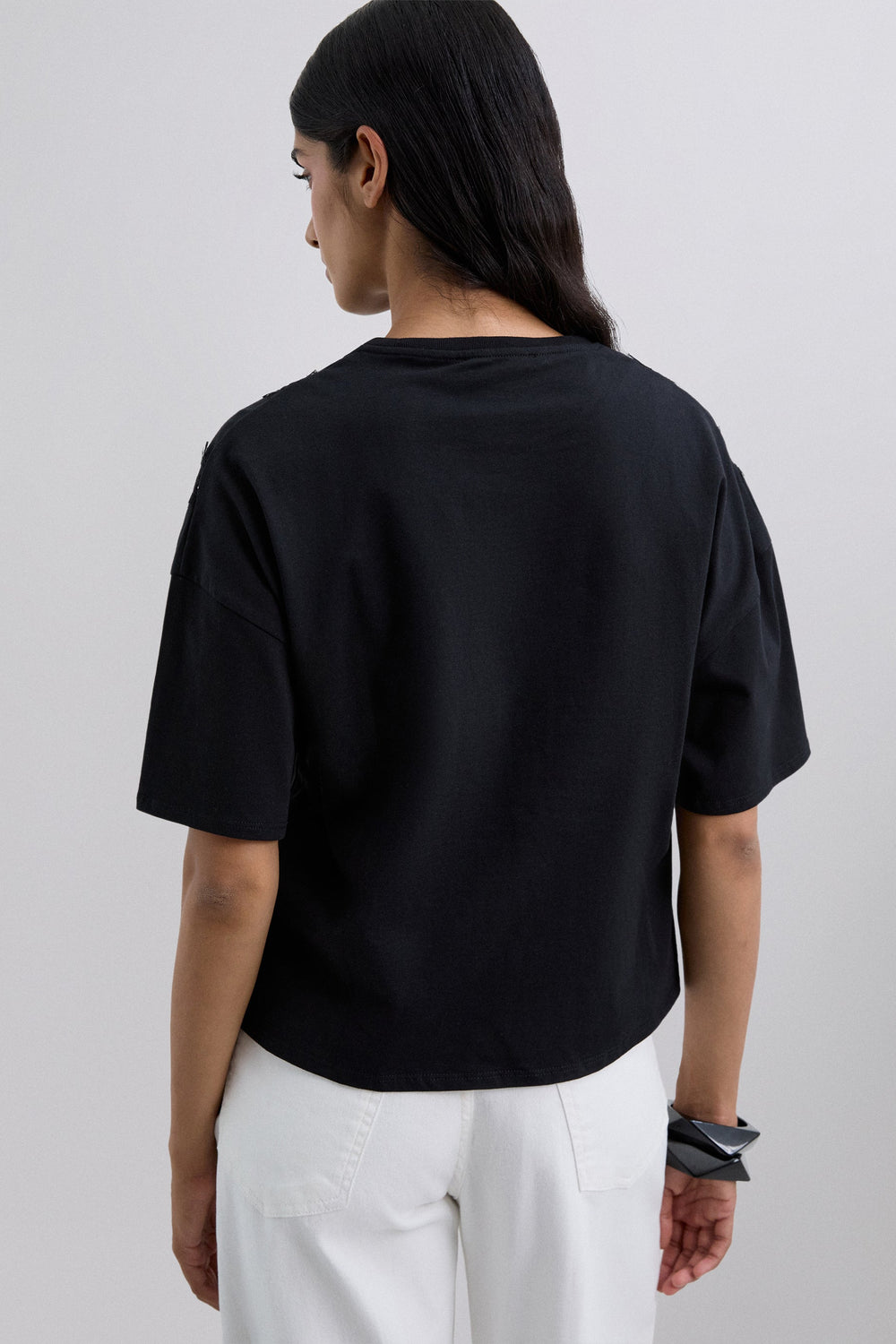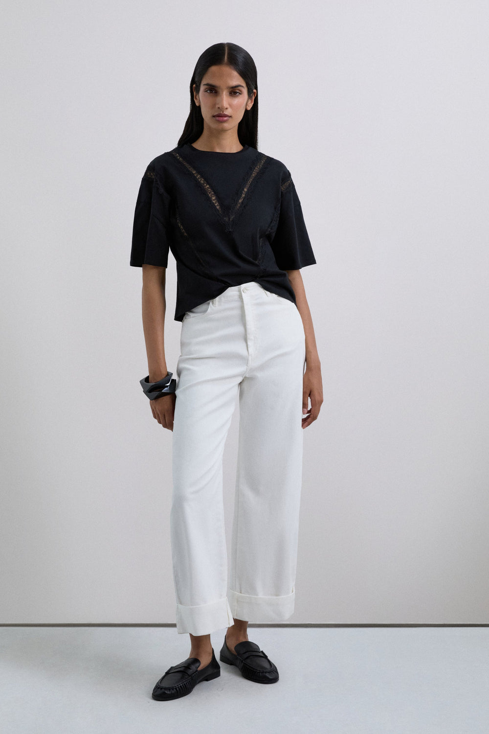 T-shirt made of 100% BCI cotton. Round neck and short sleeves. Lace detailing on front sleeves and at the front with V-neck detail.