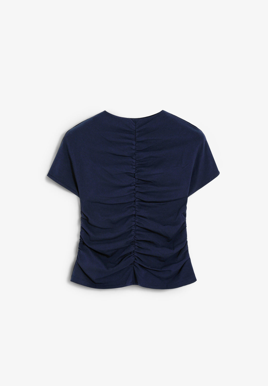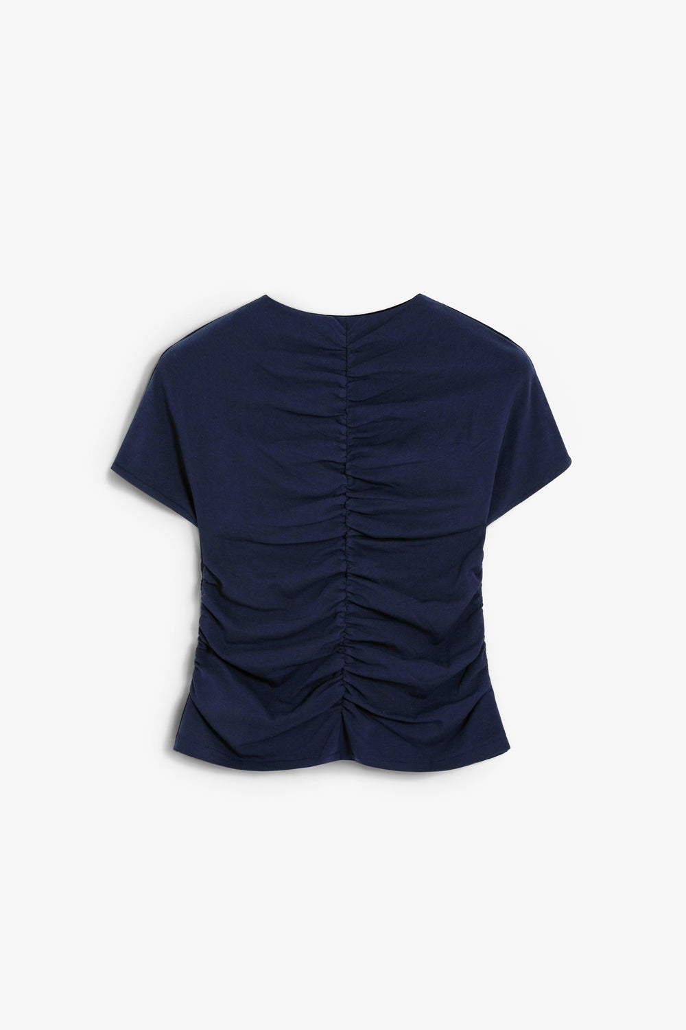 Short sleeve top with gathering at the front and centre of the back. Regular fit. Slightly V-neck.