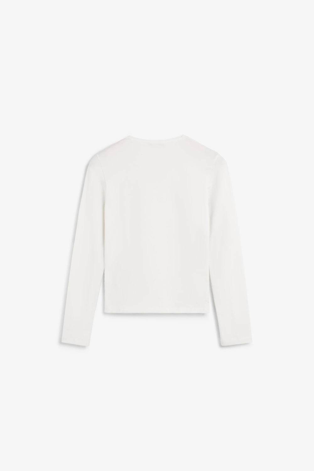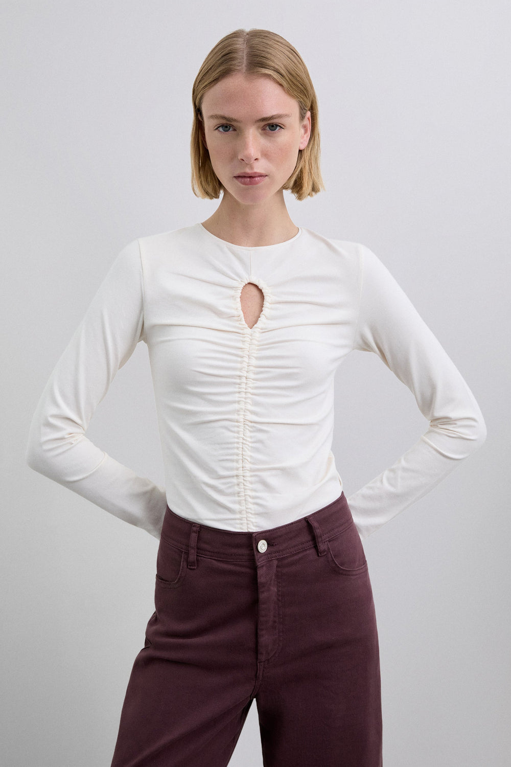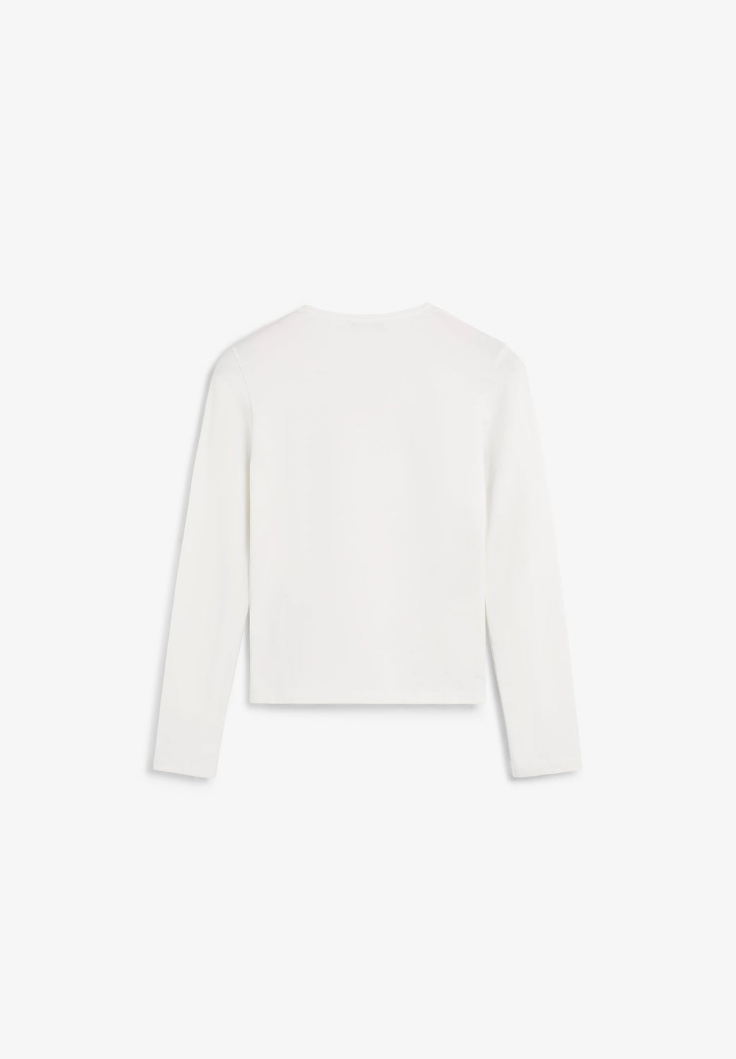 T-shirt made of slightly stretchy cotton fabric. Slim fit, round neck and long sleeves. Opening detail on the neckline and front gathers.