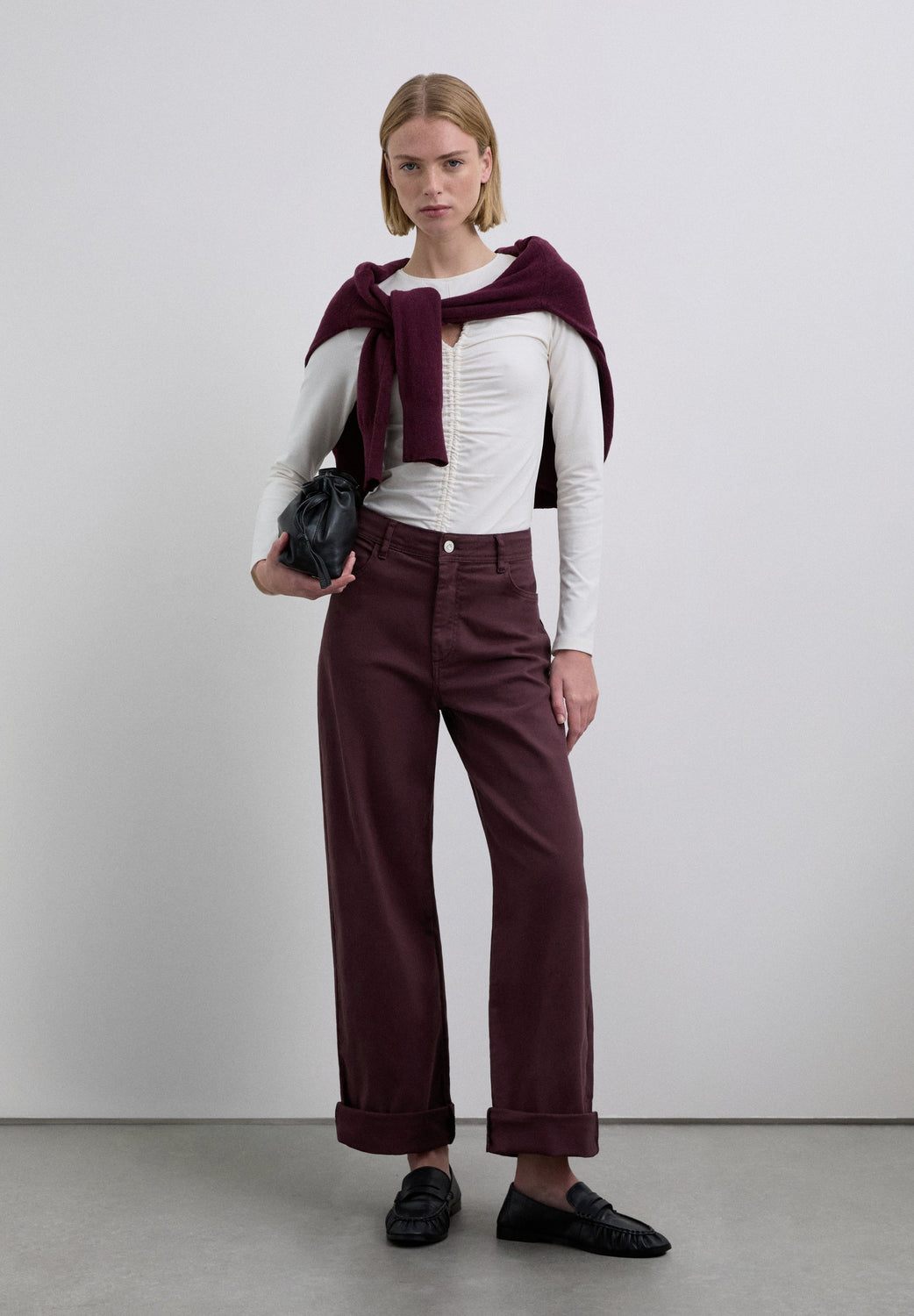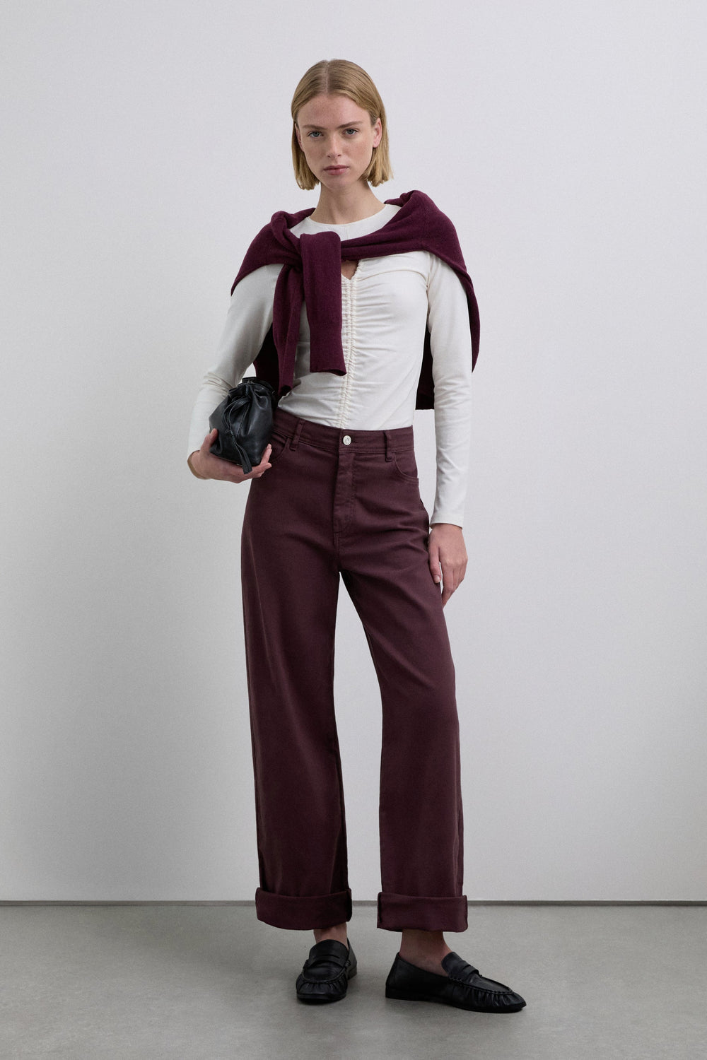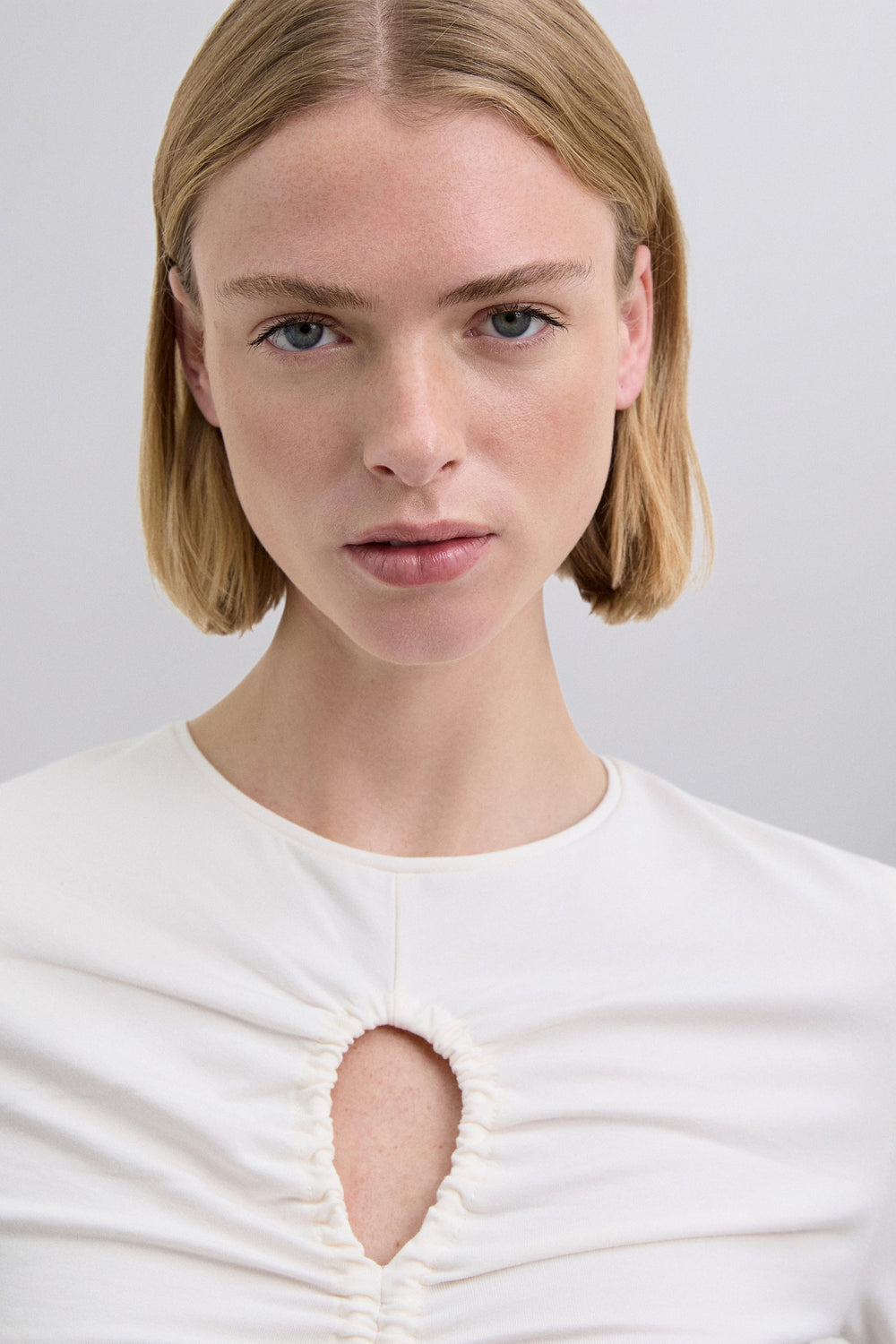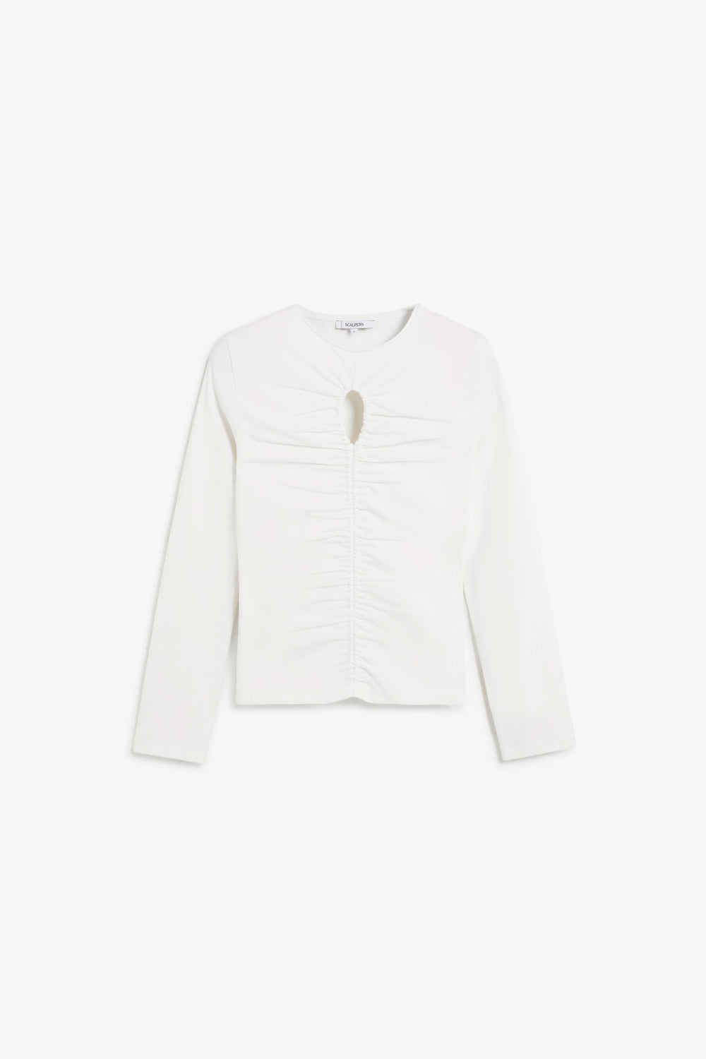 T-shirt made of slightly stretchy cotton fabric. Slim fit, round neck and long sleeves. Opening detail on the neckline and front gathers.