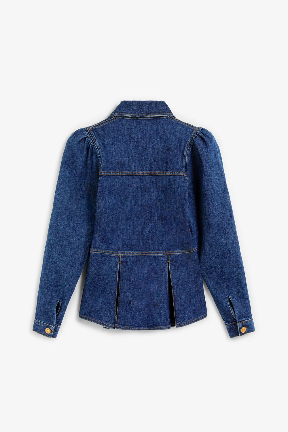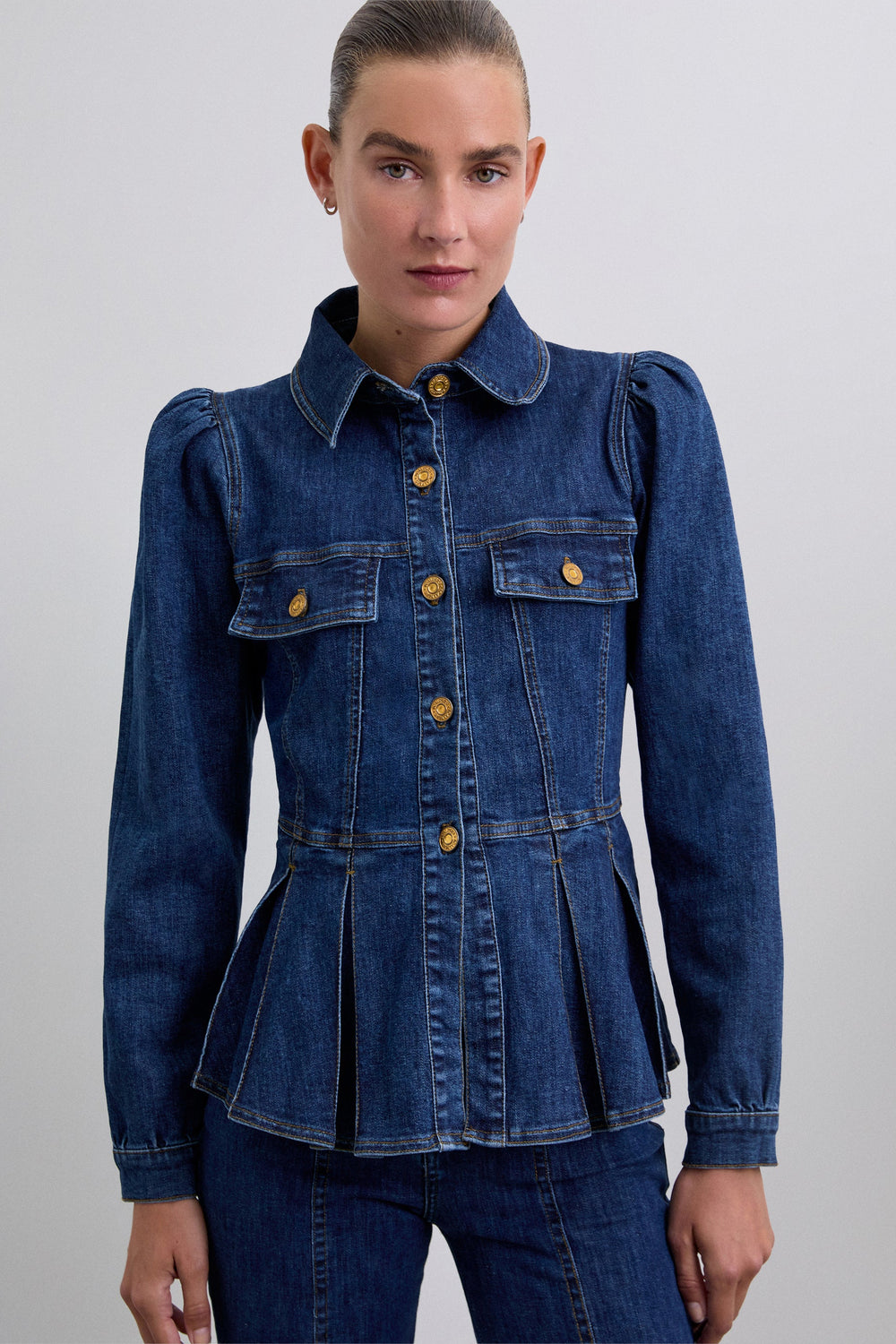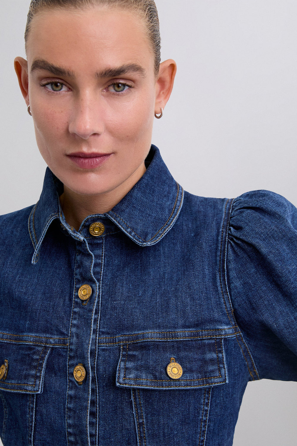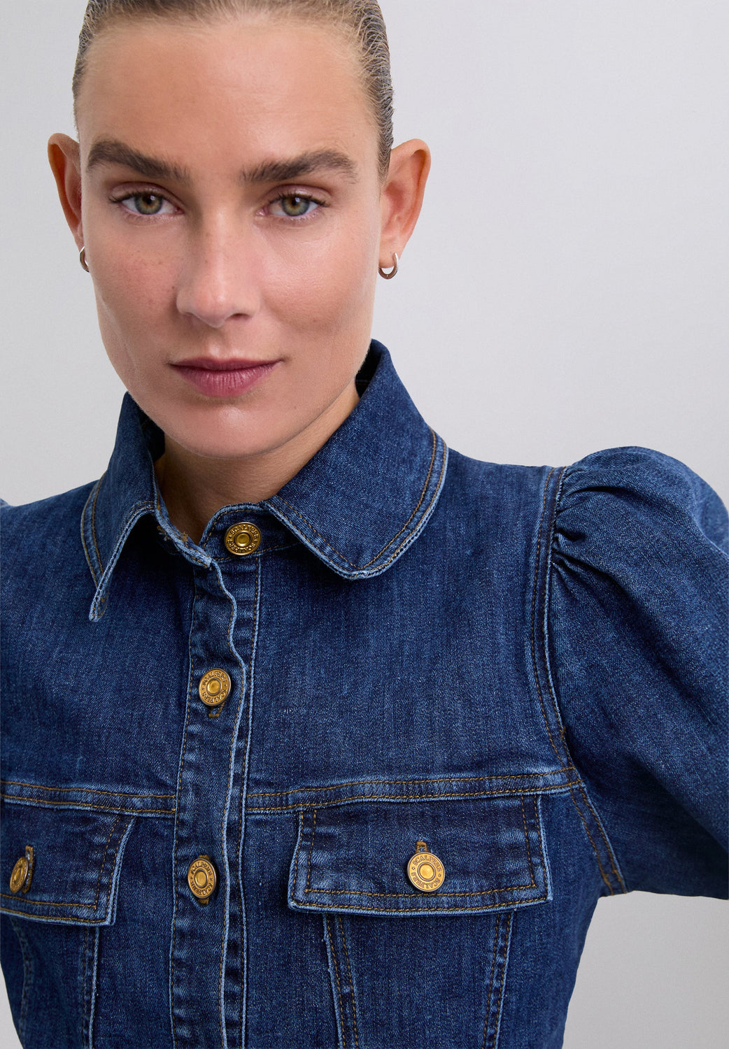 Denim shirt made of slightly stretchy cotton. Slim fit, button fastenings and long puff sleeves with buttons. Box pleat detail on the hem and gathers on the shoulders.
