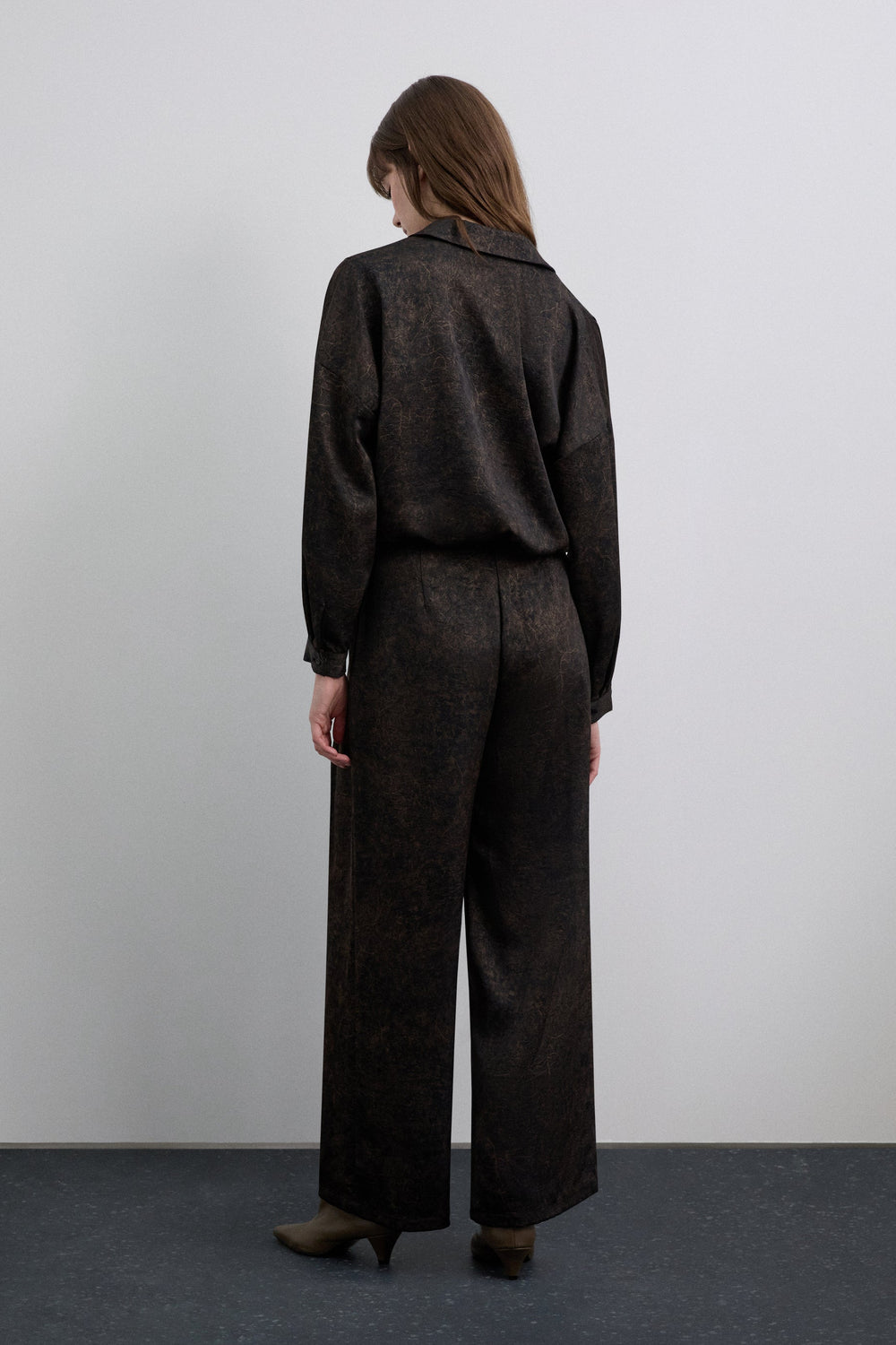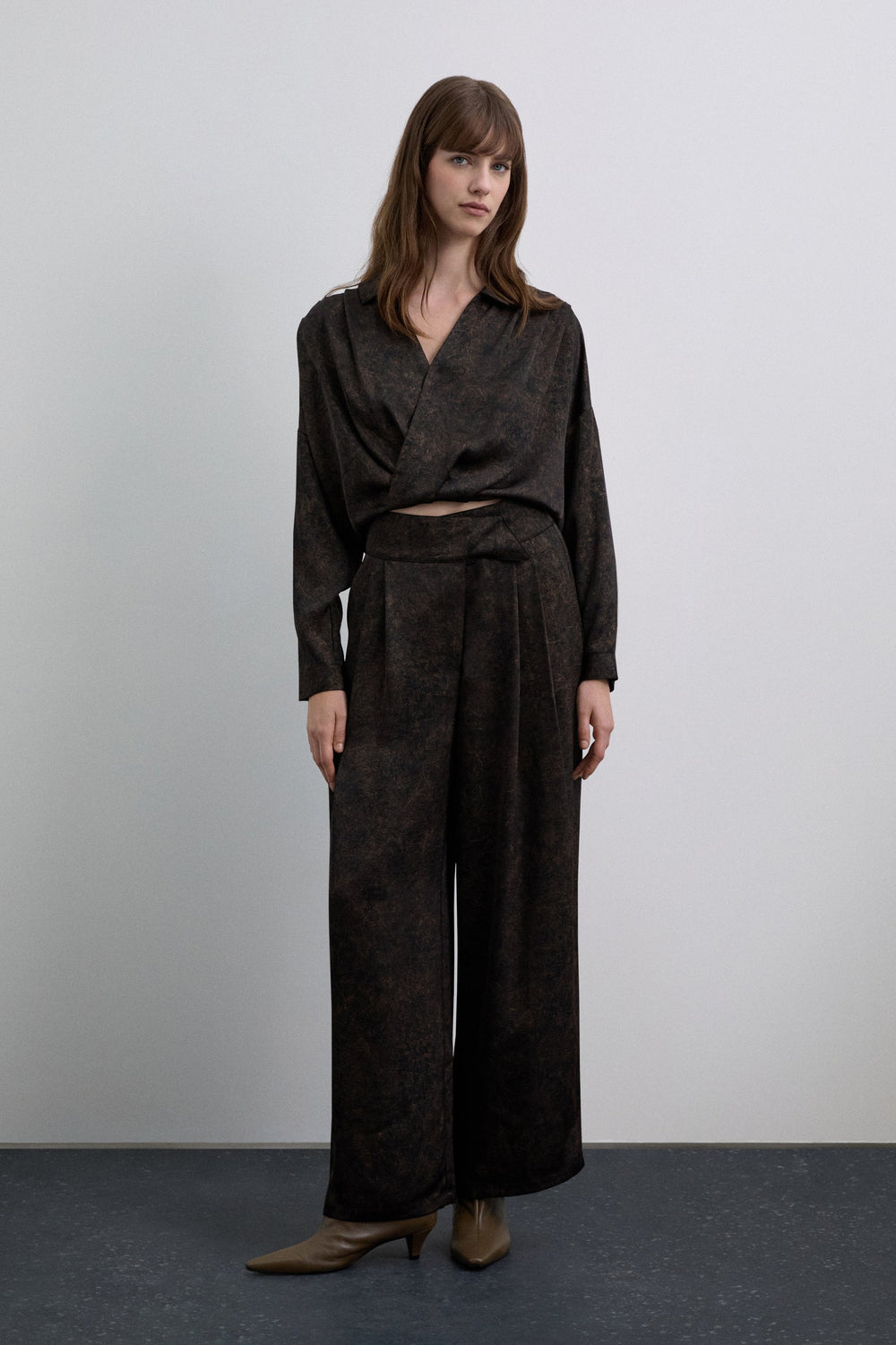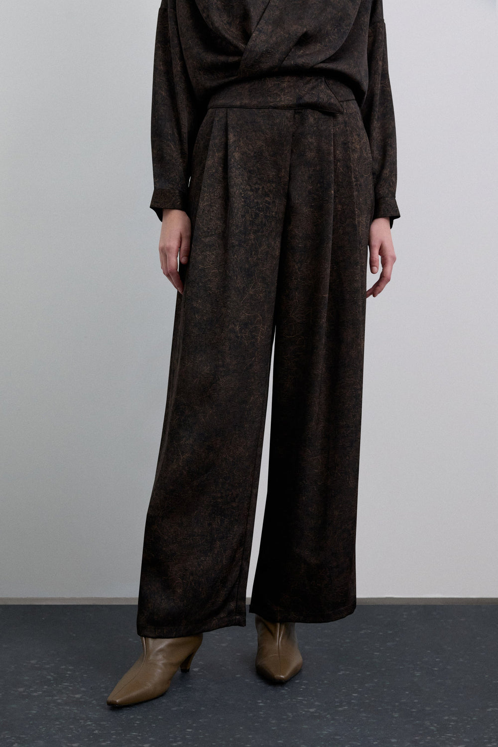 Trousers made of a flowing fabric with satin finish. Marbleised effect print. Culotte style. Front zip fastening and side pockets.