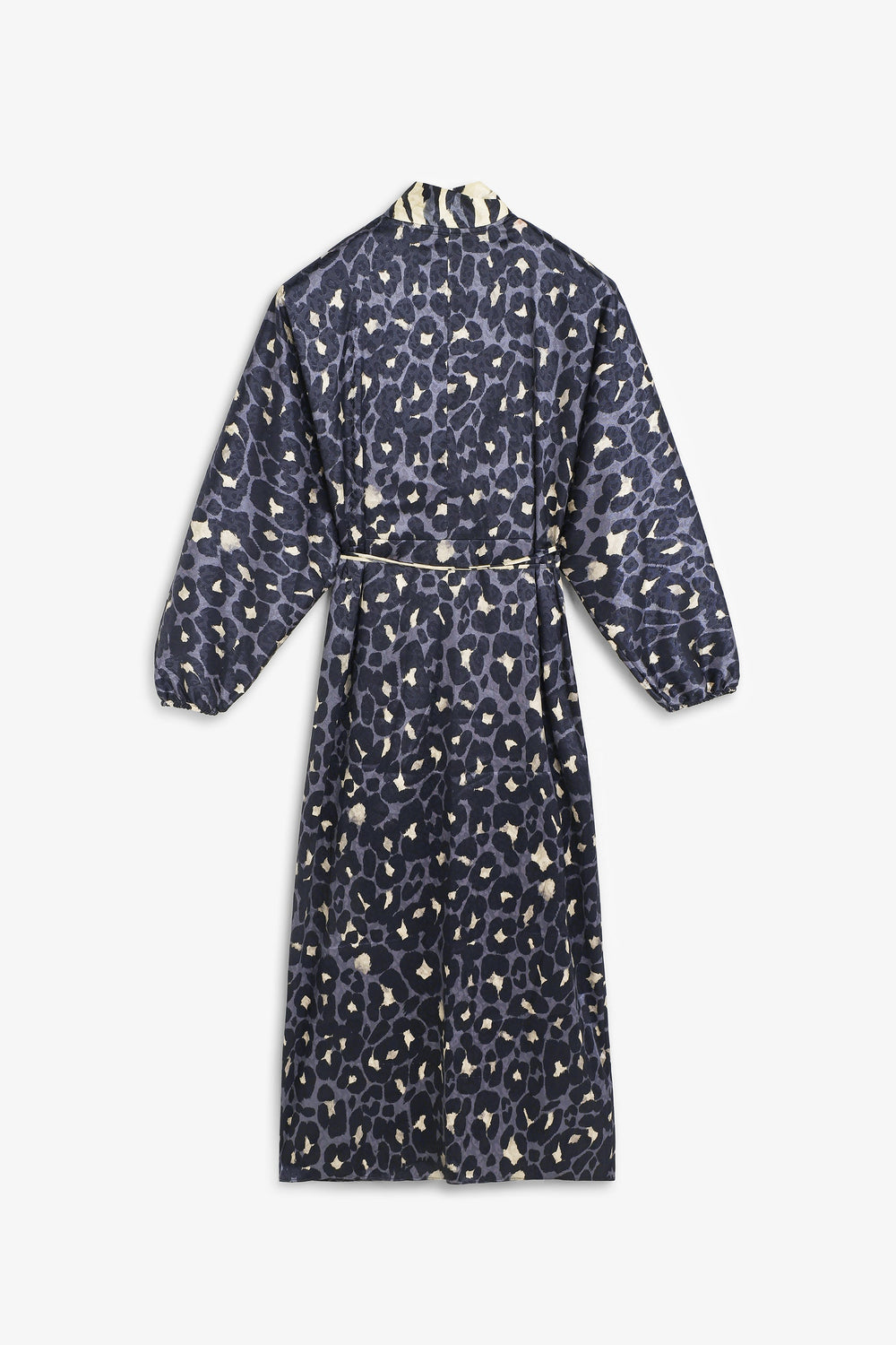 Long dress with animal print. Long, slightly puffed sleeves with gathered cuffs. Adjustable tie front. V-neck.