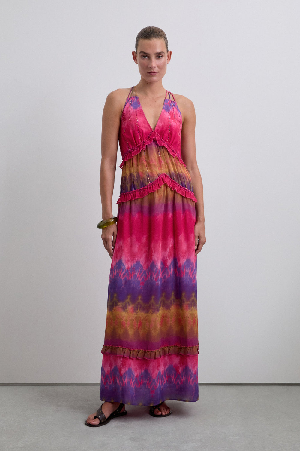Long dress made of flowing fabric. V-neck with tie-dye print and ruffle details. Hanging ribbons with coloured beads on collar and waist.