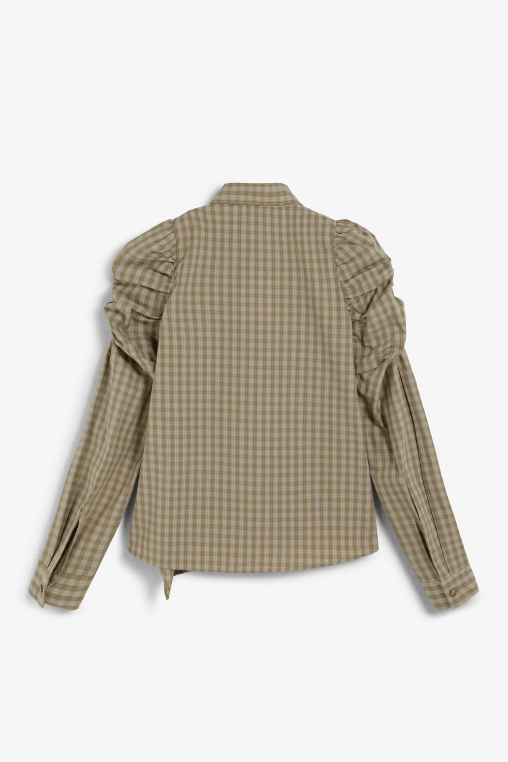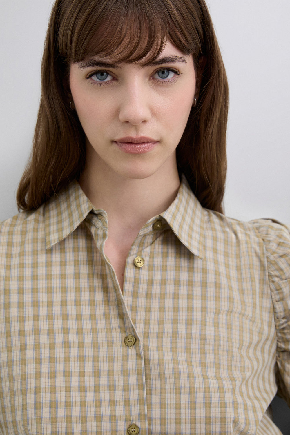 Printed shirt made of 100% cotton. Long puffed sleeves. Asymmetric hem. Front button fastening.