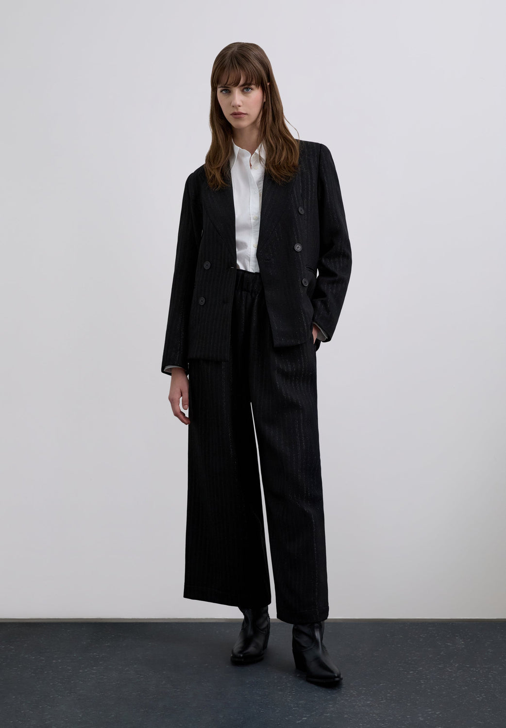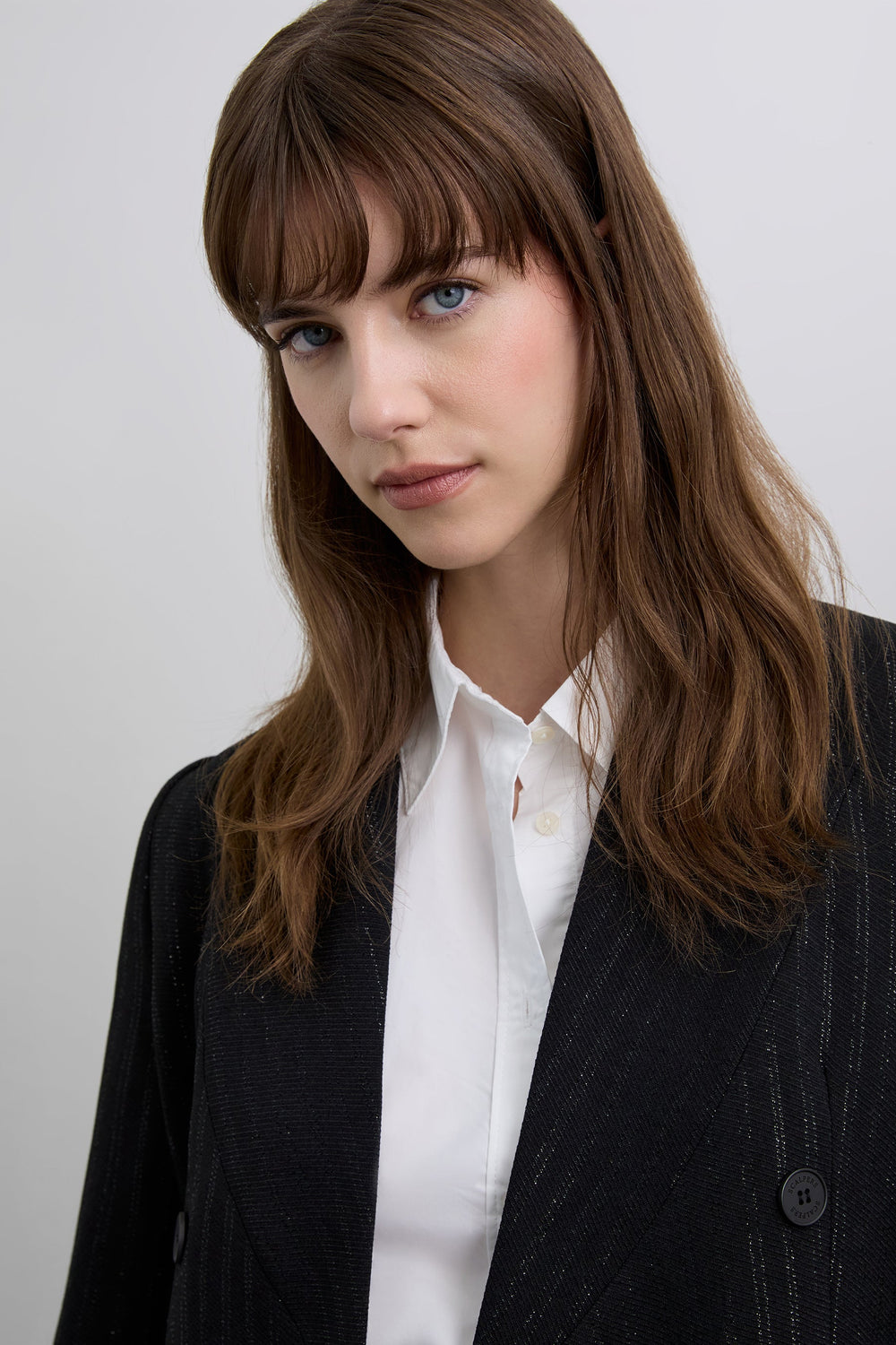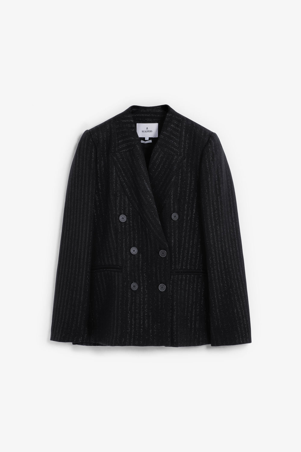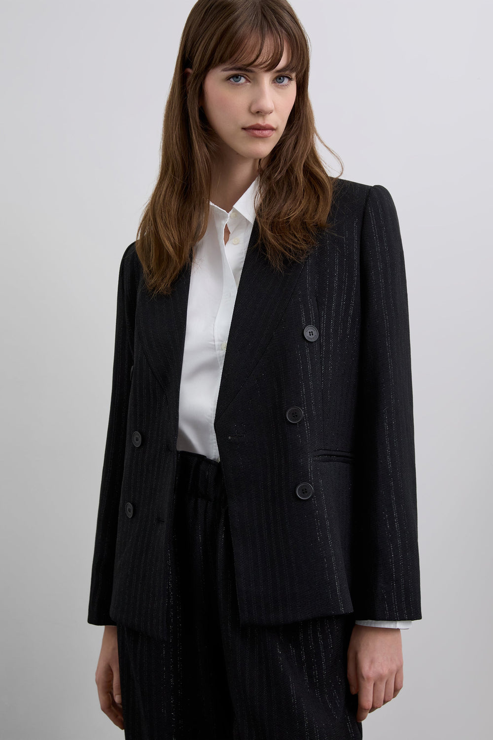 Double-breasted pinstripe blazer. Lapel collar. Regular fit. Double-breasted button fastening. Front flap pockets.