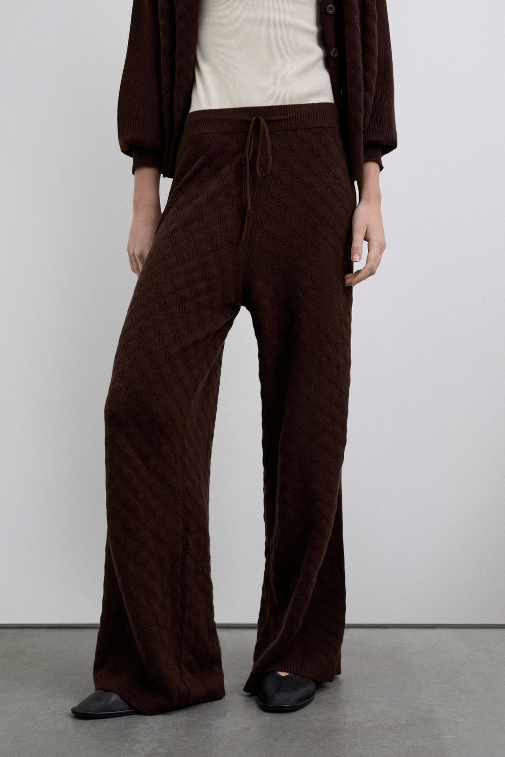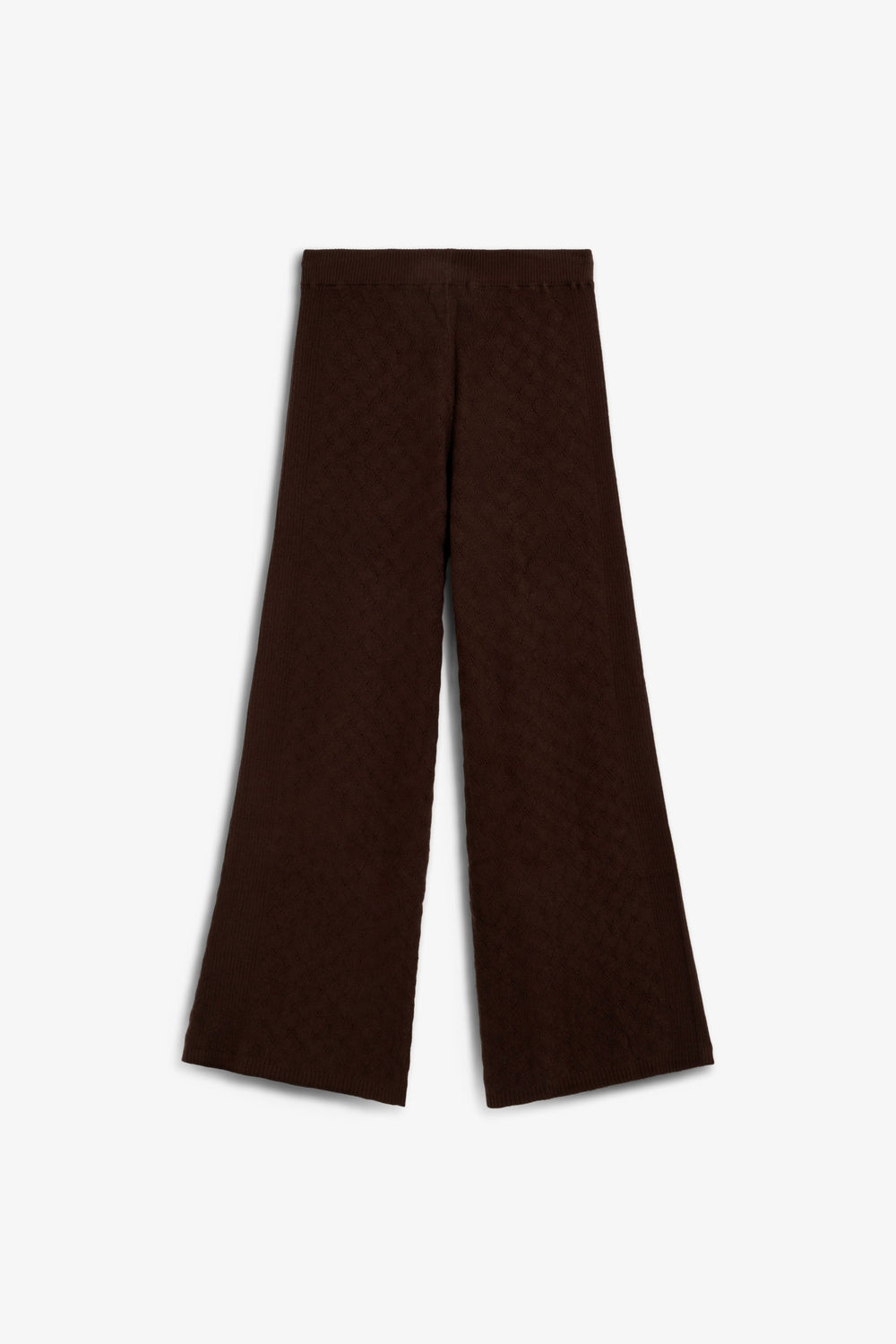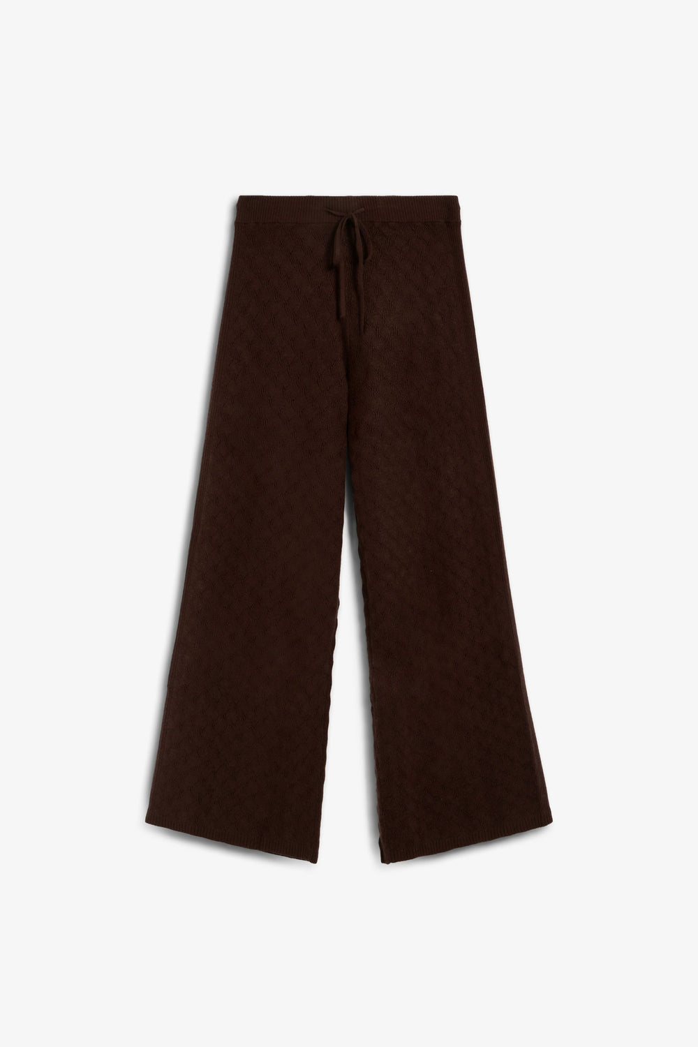 Long trousers featuring an elasticated waistband with drawstring. Contrast stitching on the front, back and sides.