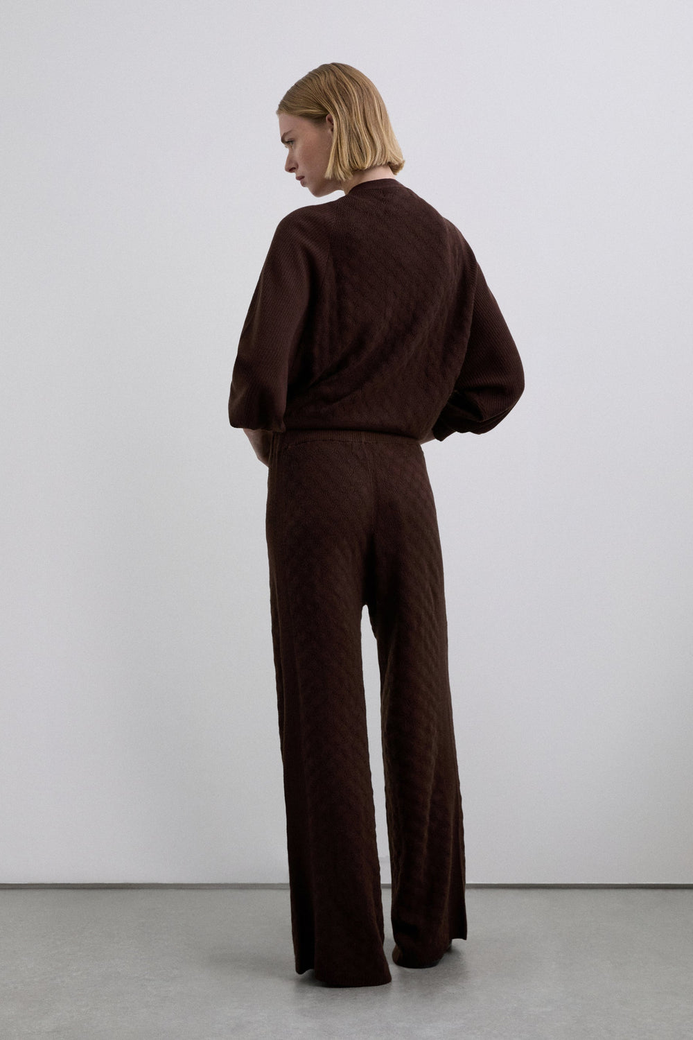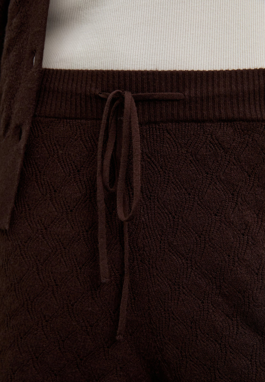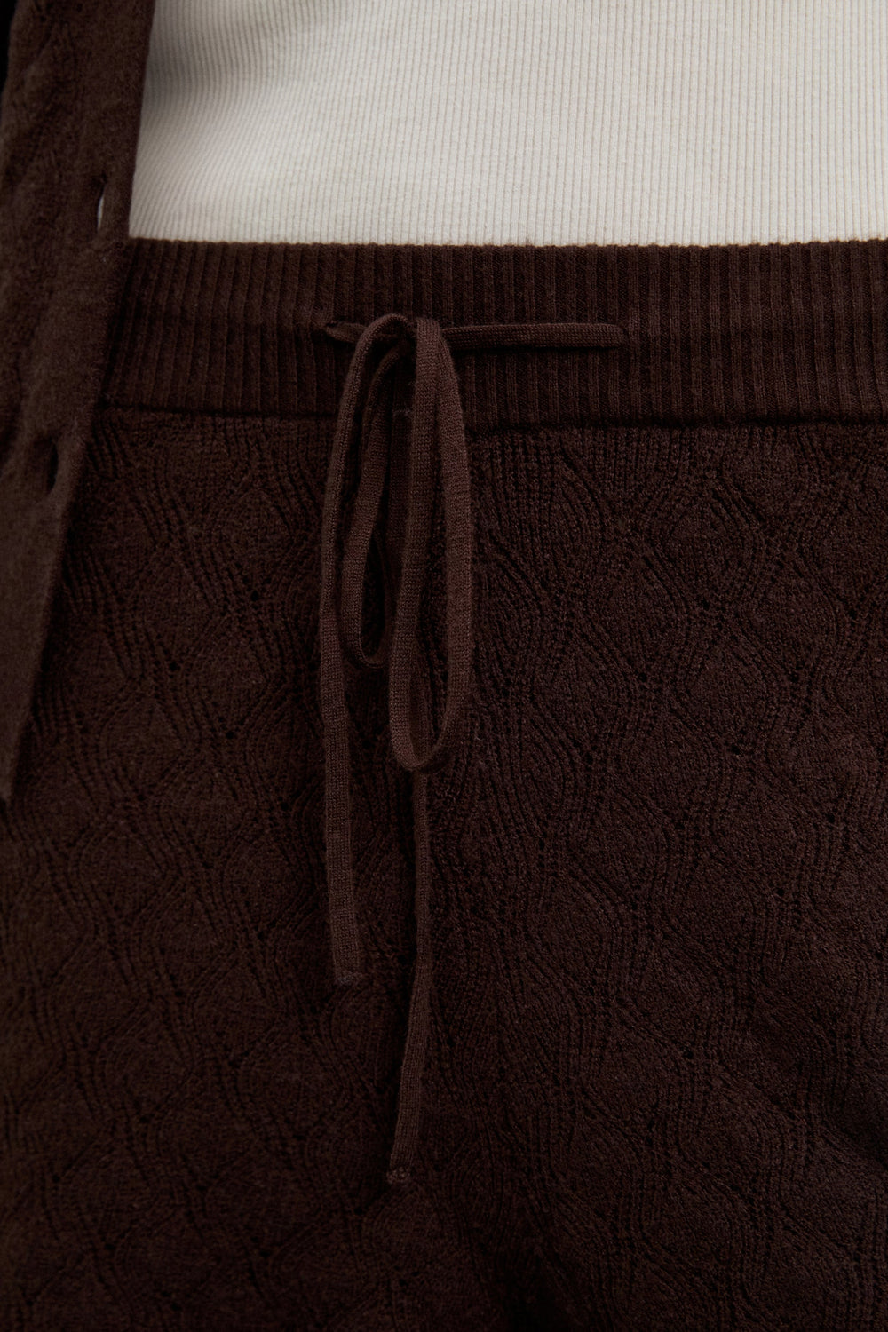 Long trousers featuring an elasticated waistband with drawstring. Contrast stitching on the front, back and sides.
