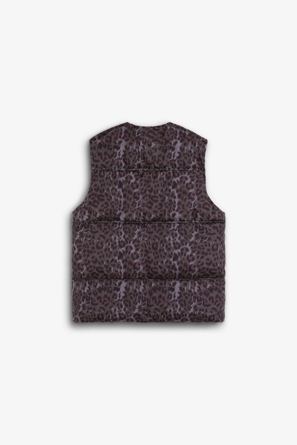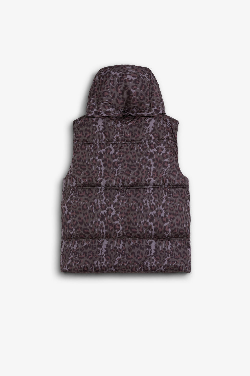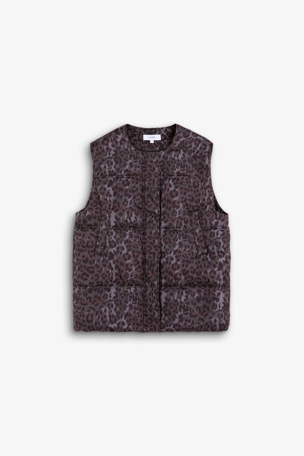 Padded animal print gilet. Concealed zip and press stud fastening. Loose fit. Detachable padded neck scarf. Adjustable drawstring hem. Two front pockets.