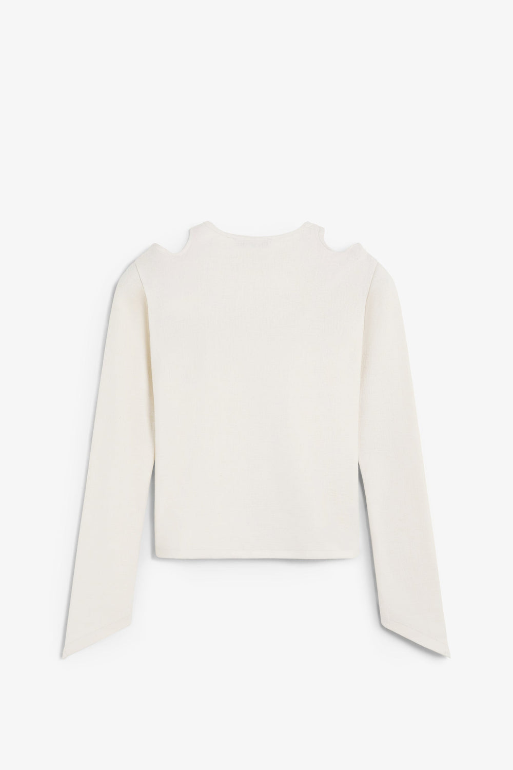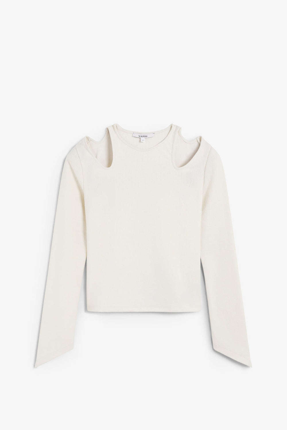 T-shirt made of cotton. Long sleeves with asymmetric finish. Round neck. Shoulder slits.