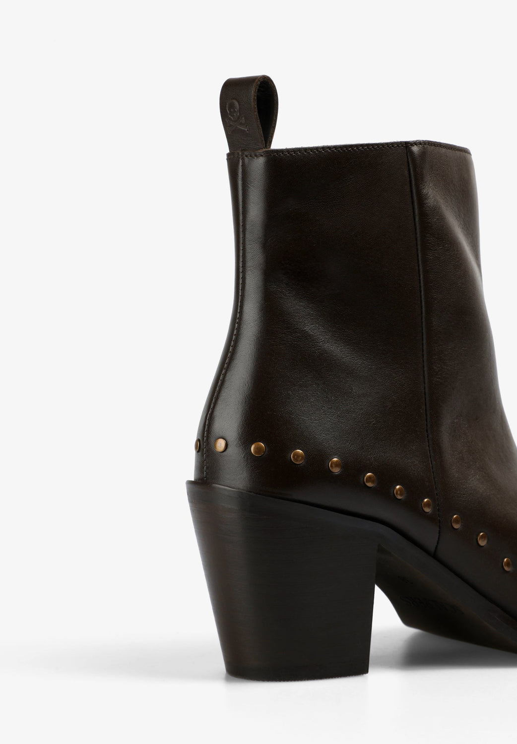Leather-look ankle boots with pointed toe and wide heel. They feature stud detailing around the edges and an inner side zip.