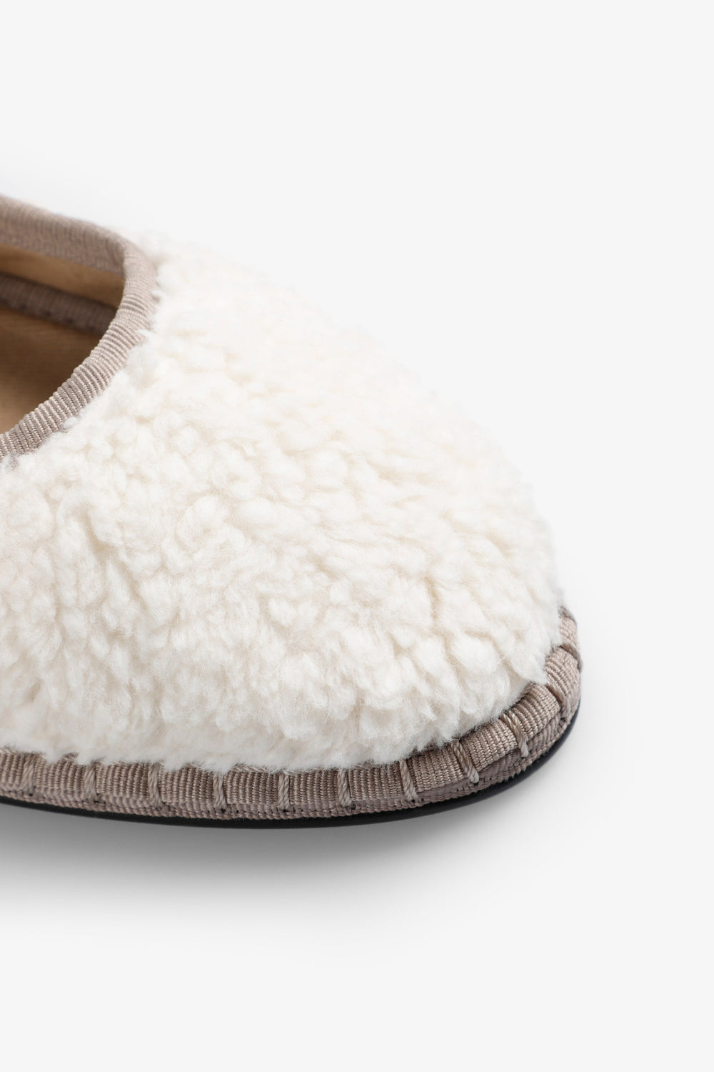 Ballet flats made of an organic cotton blend. Faux shearling trim. Adjustable strap and buckle fastening. Contrast embroidered logo detail.