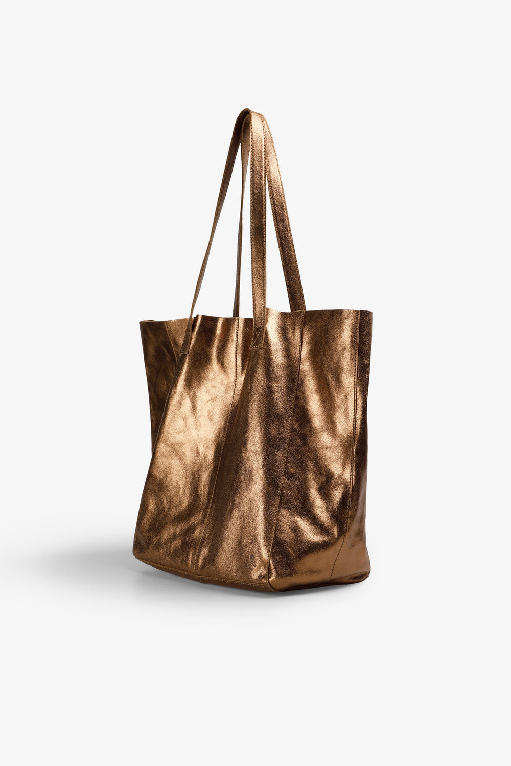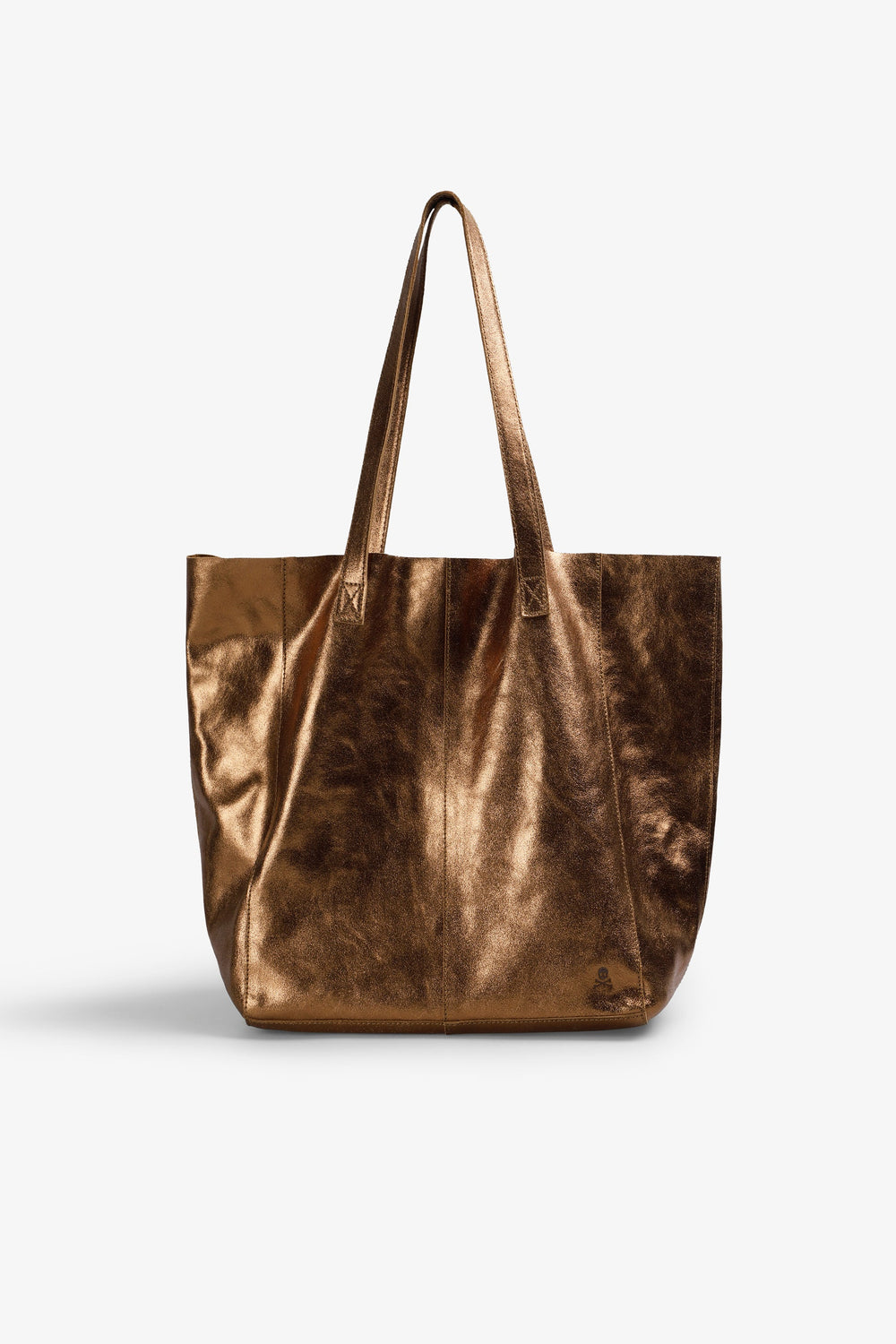 Tote bag made of 100% suede with metallic finish. Reverse side leather inside with matching zip-up wallet.