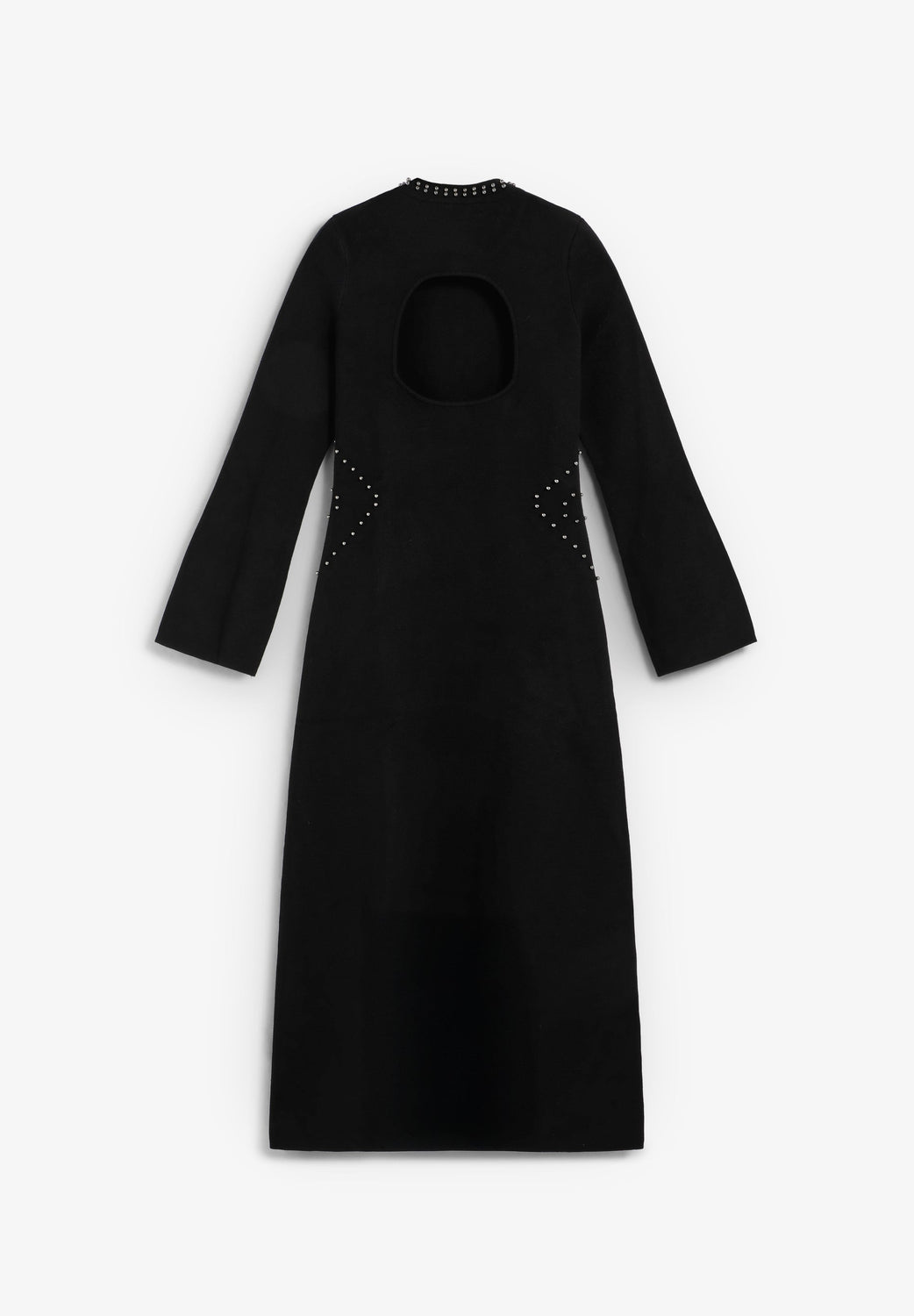 Knitted dress made of a viscoe blend. Slim fit. Round neck. Long flared sleeves. Stud detailing on ncollar eck and waist. Back vent.