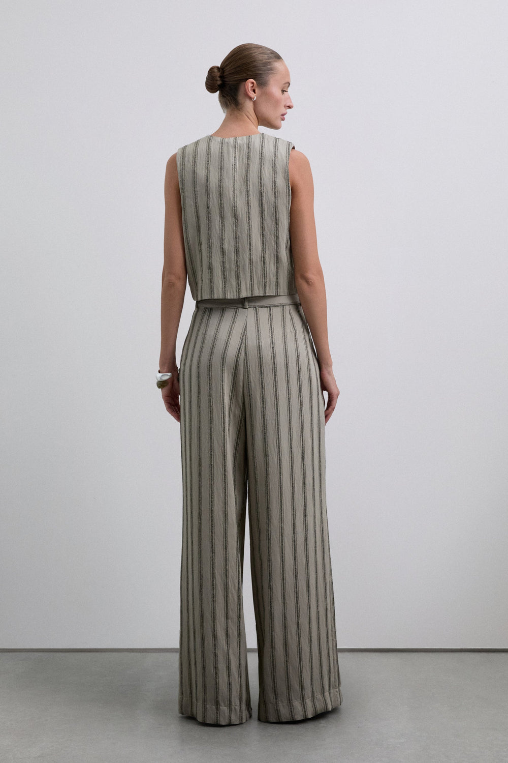 Pinstripe print trousers. Zip and top button fastening. Belt loops.