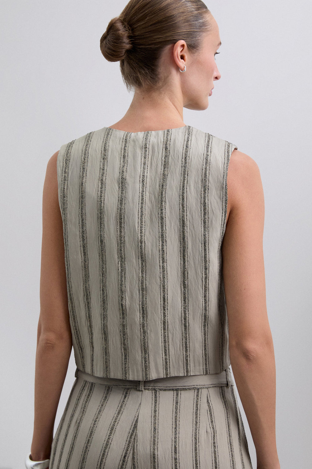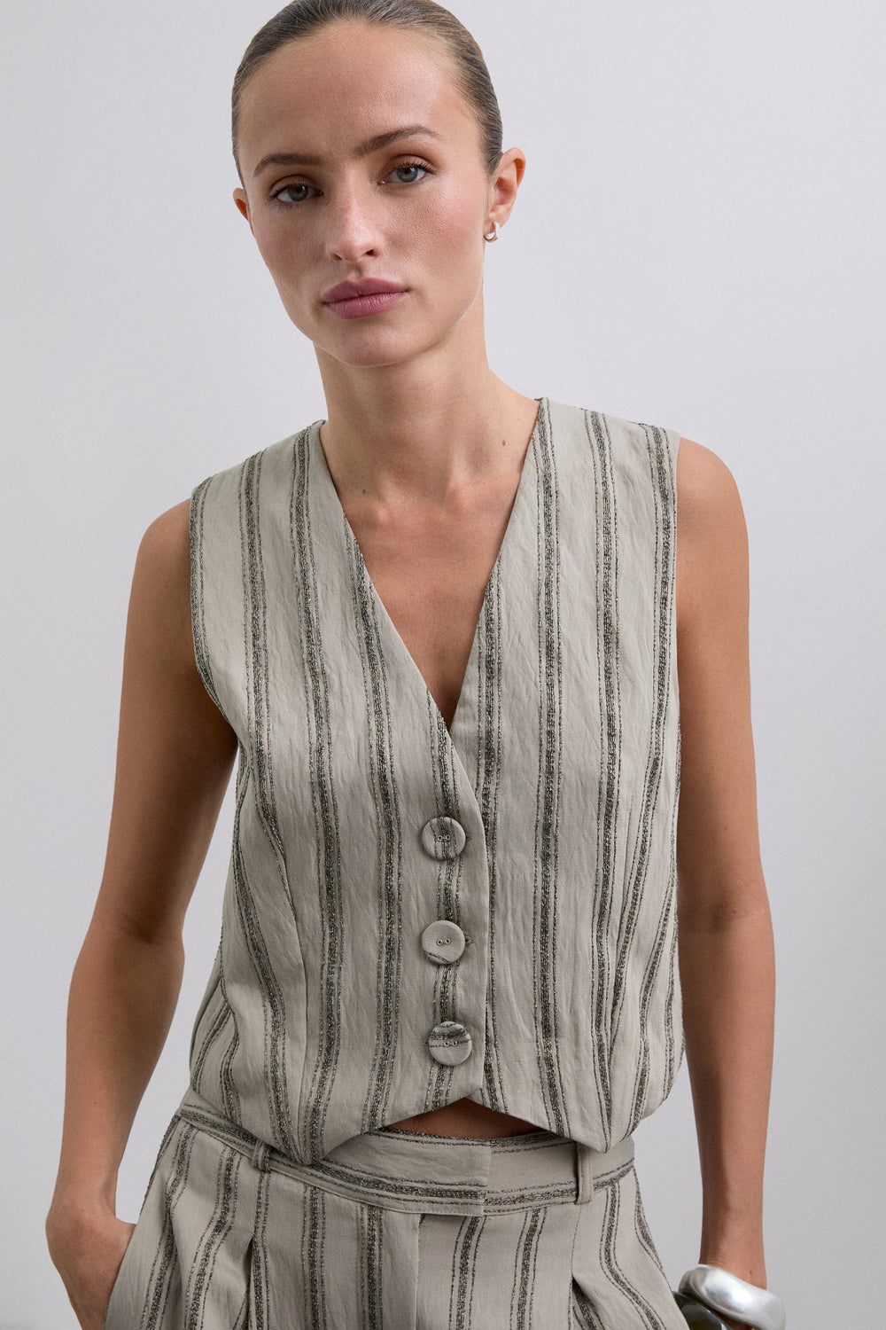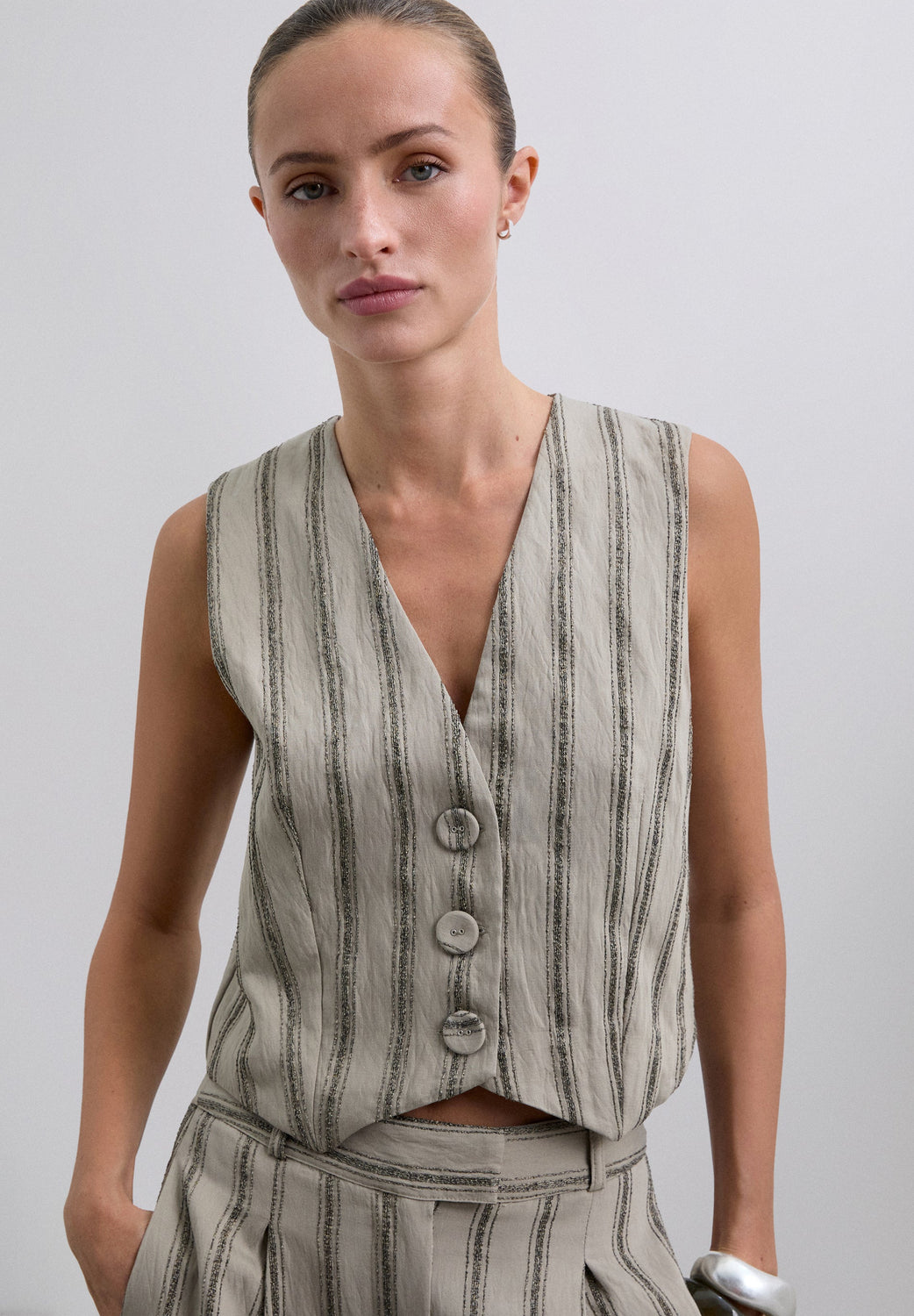 Striped waistcoat with metallic thread details. Made of flowing fabric. Regular fit. Button fastening. V-neck. Sleeveless design.