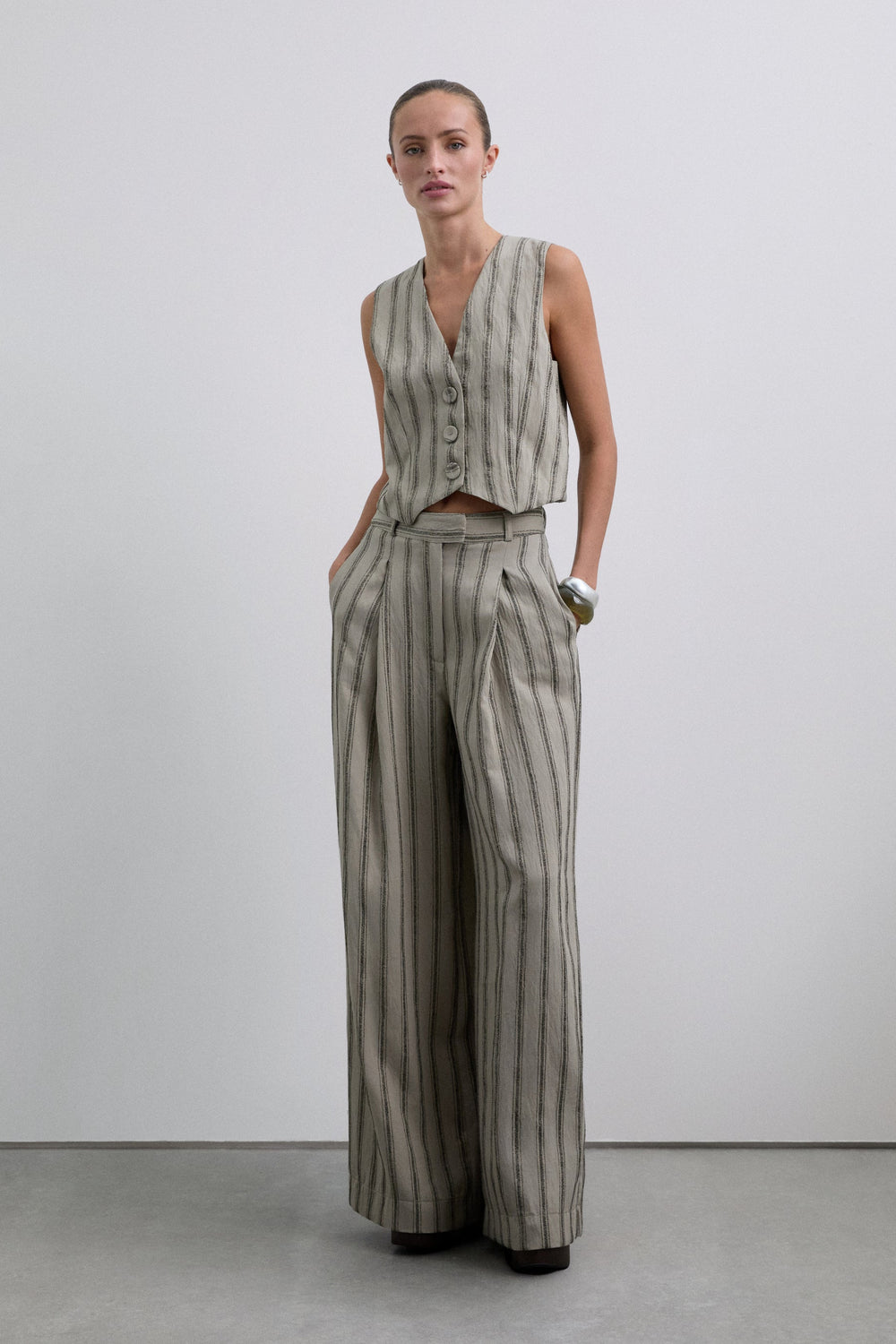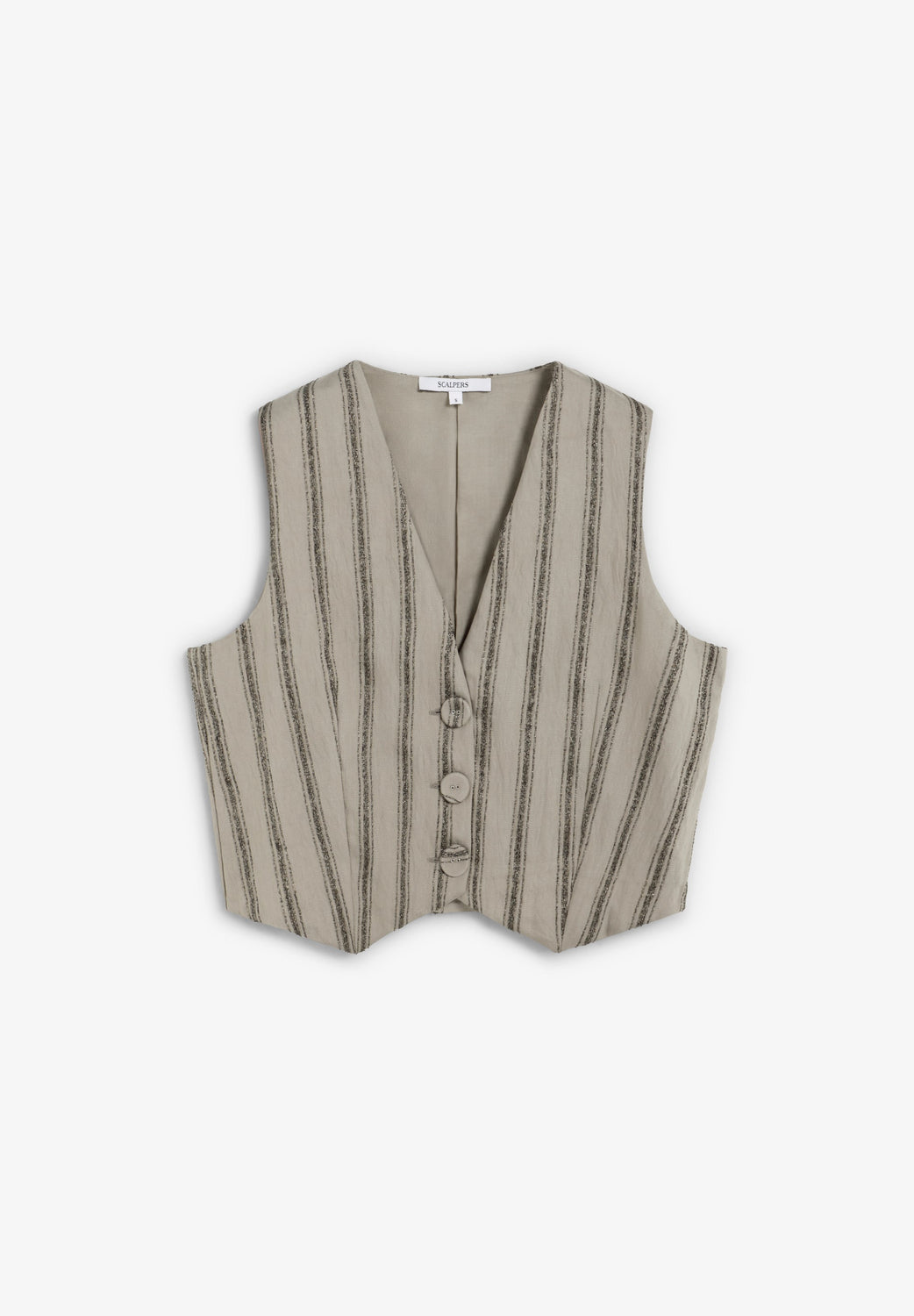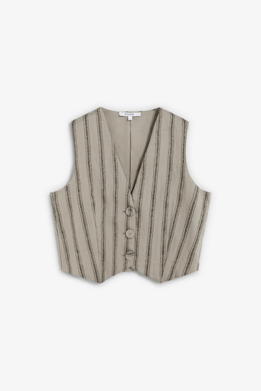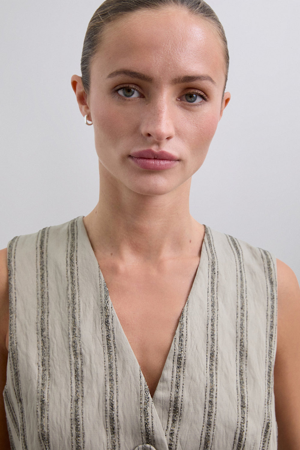Striped waistcoat with metallic thread details. Made of flowing fabric. Regular fit. Button fastening. V-neck. Sleeveless design.