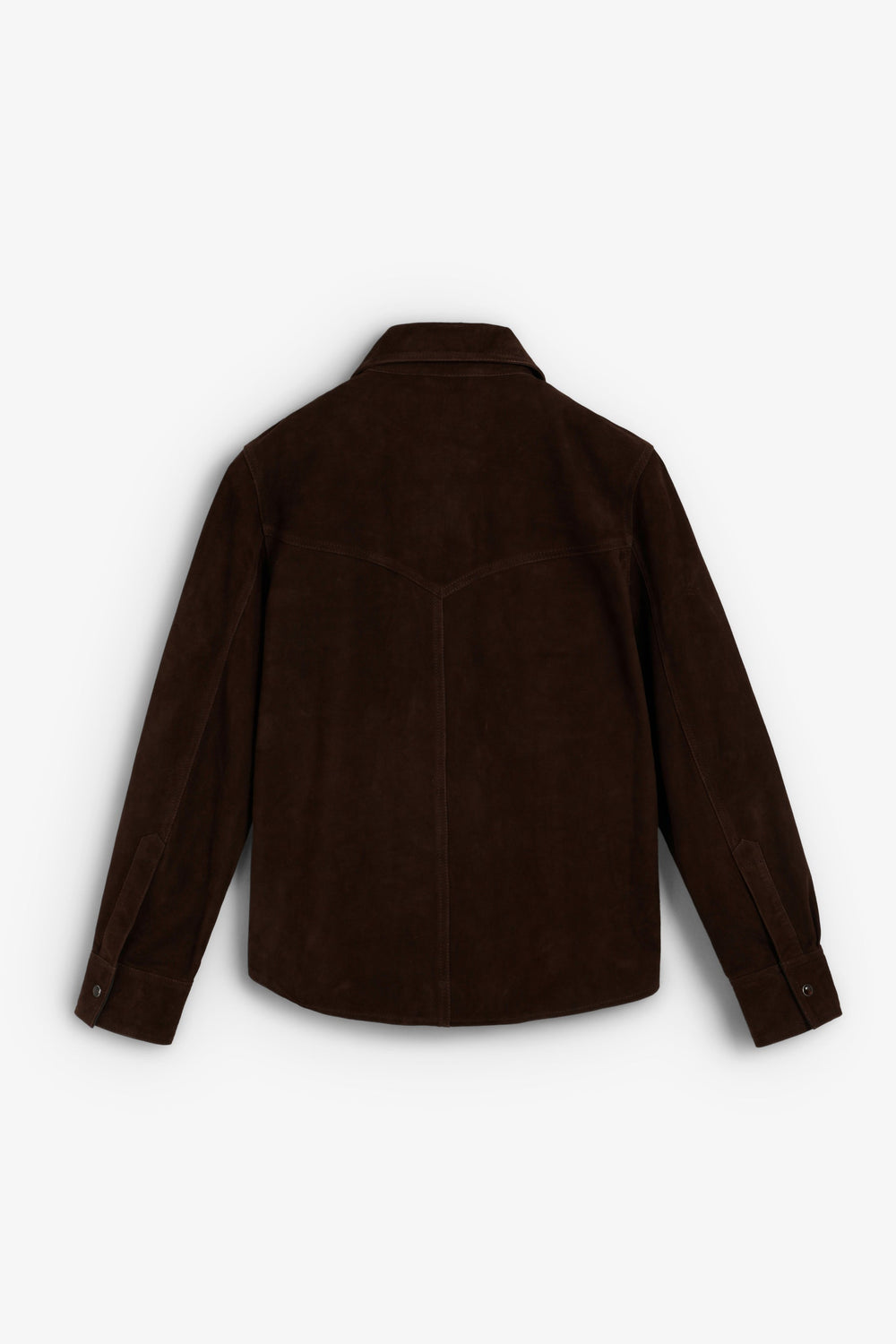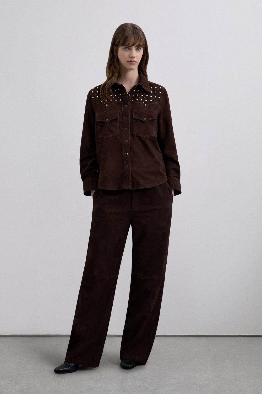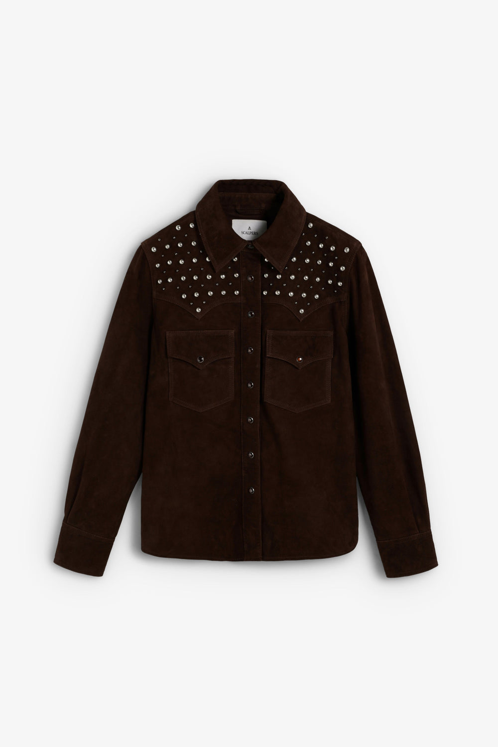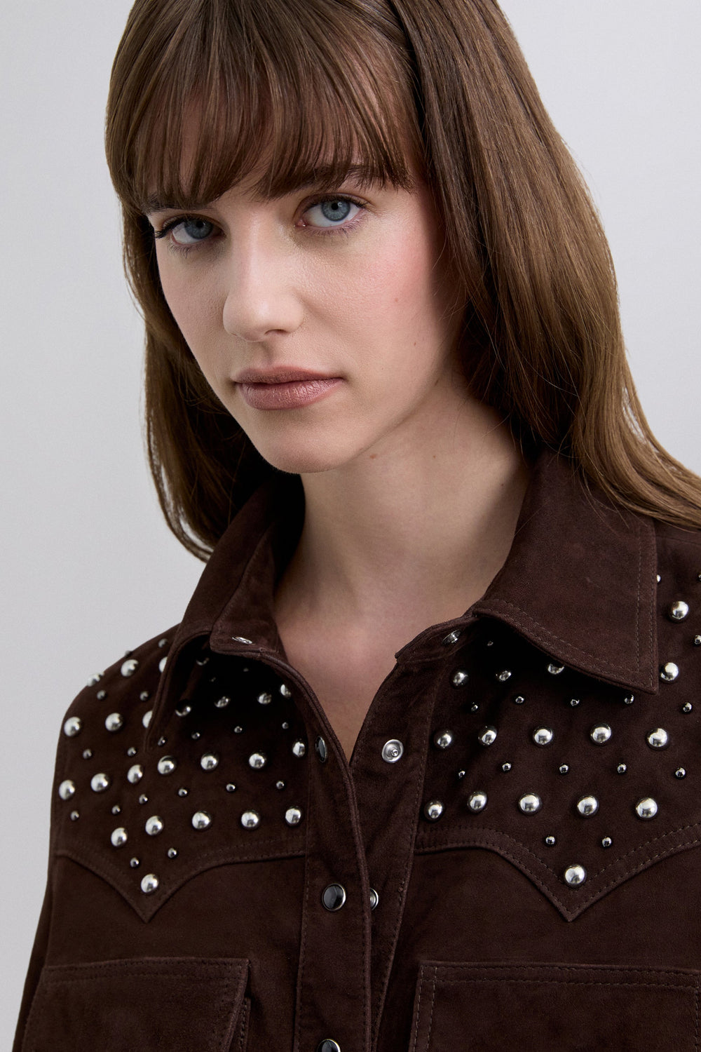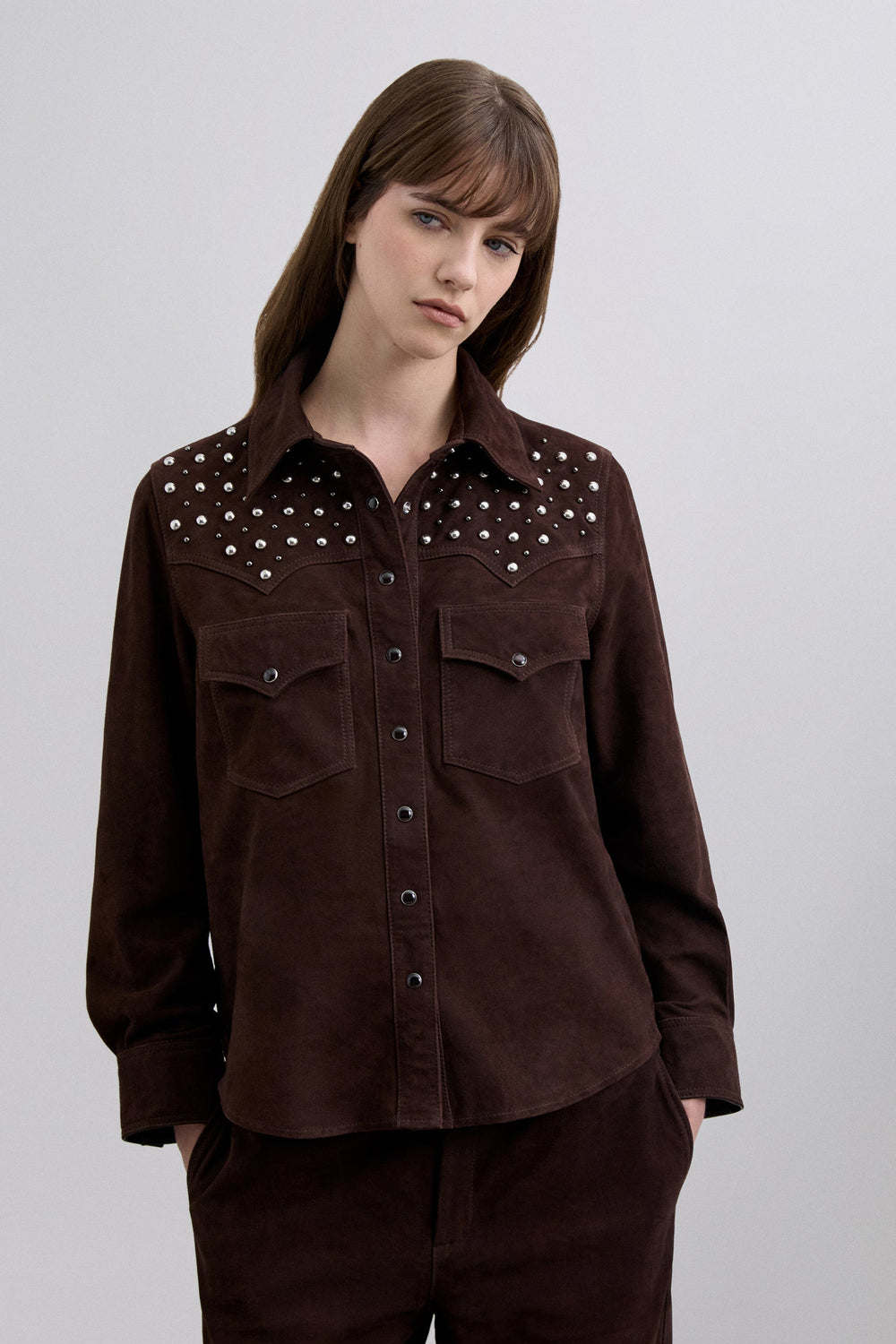 100% suede shirt. Long sleeves and button fastening on the front and cuffs. Stitching detail on the back. Stud detailing around the collar.