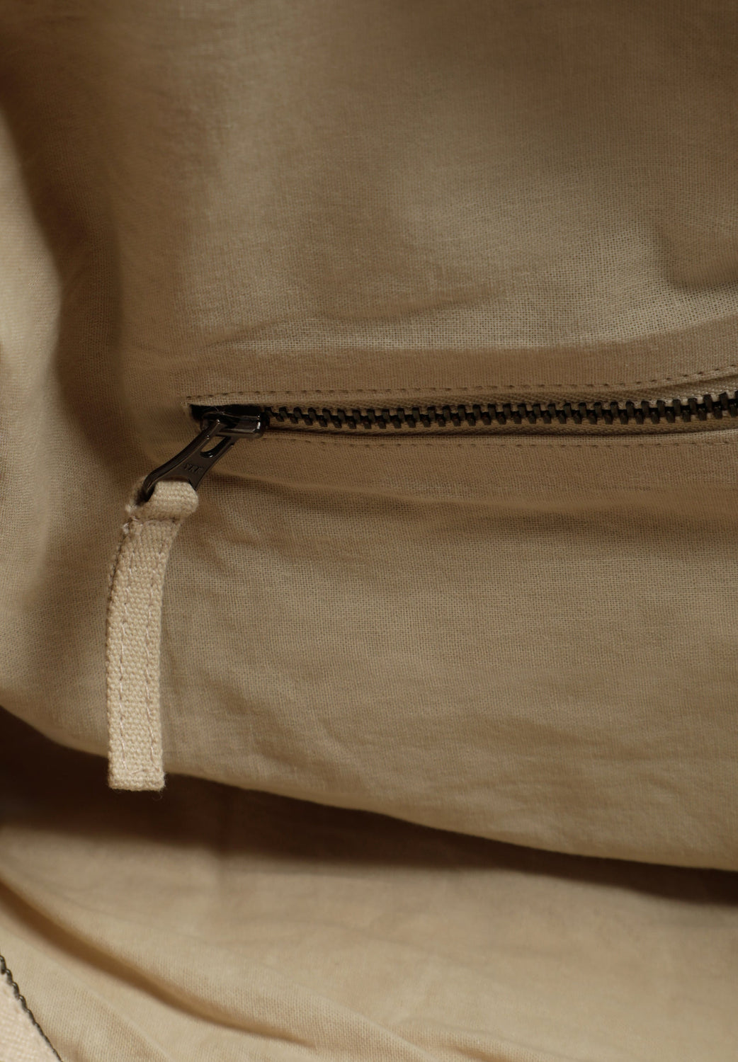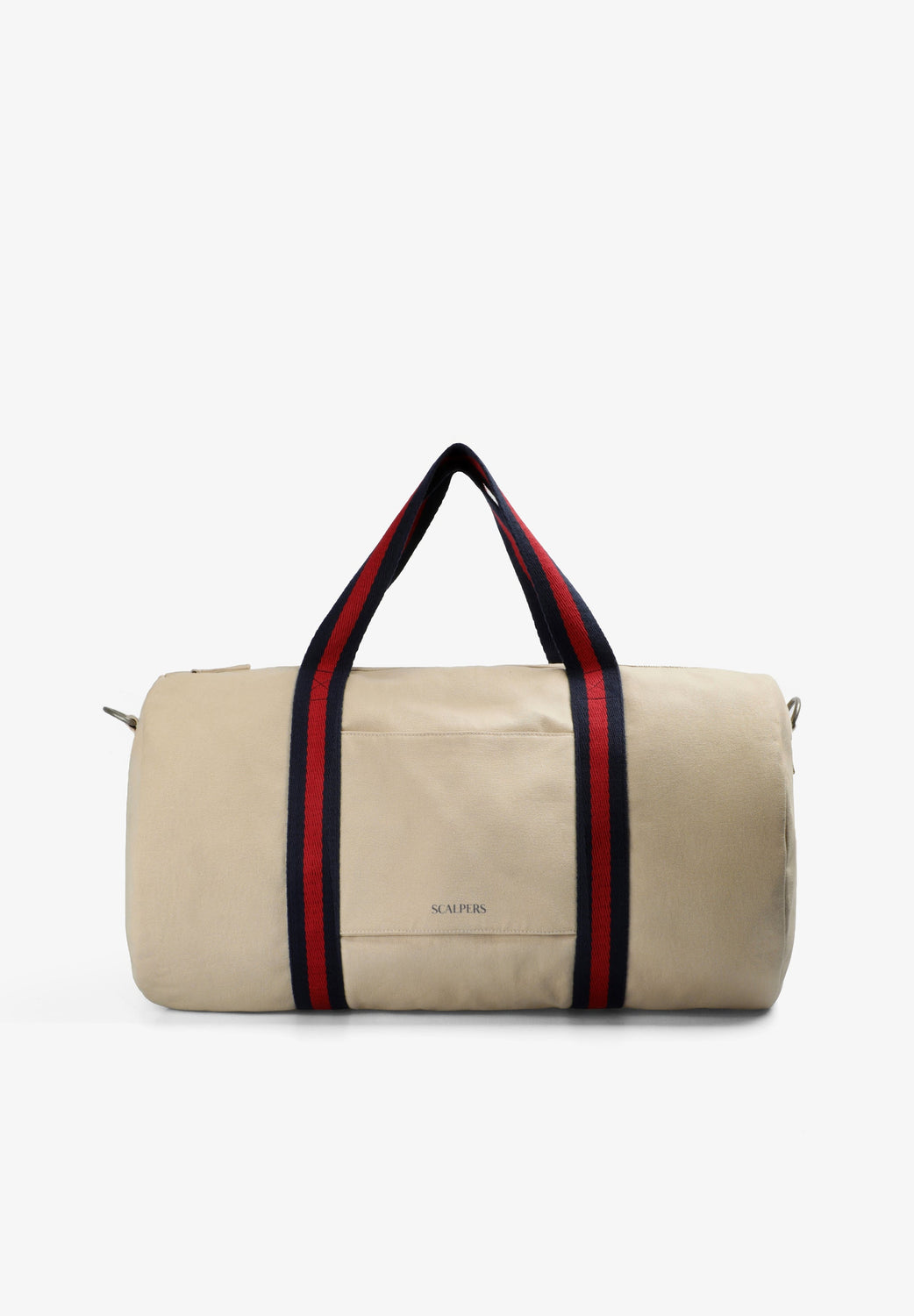 Travel bag made of canvas fabric with contrast straps. Skull detail on the front  Customised appliqués. Top handle and shoulder strap.