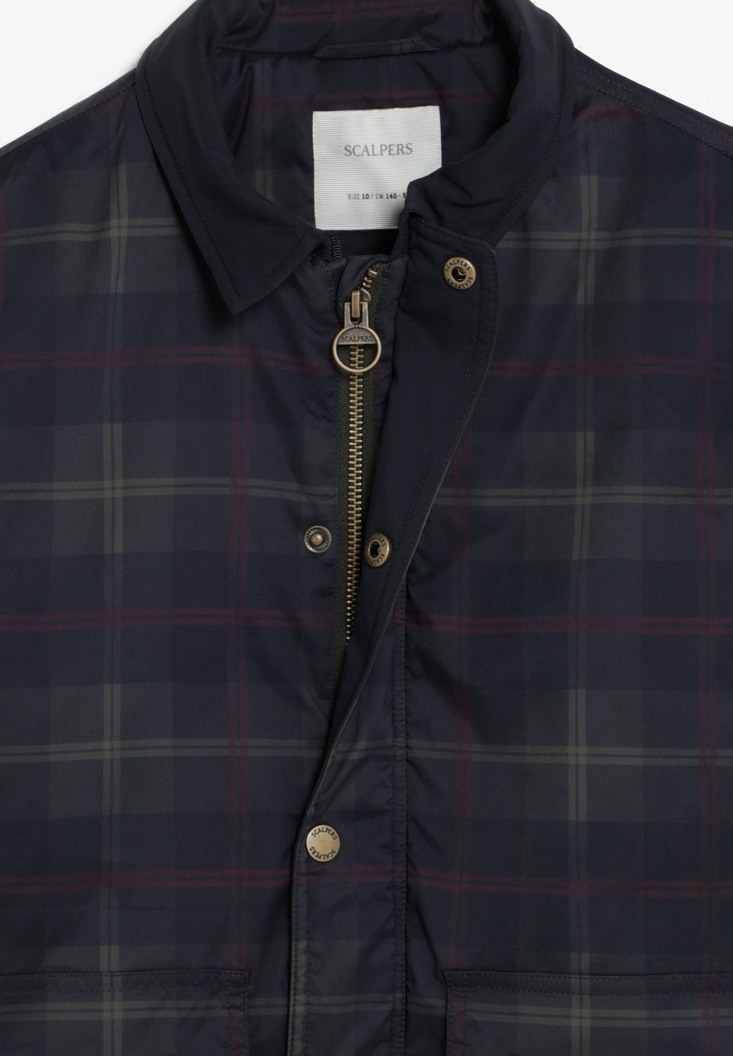 Checked jacket with contrast collar. Concealed main zip fastening with customised zip puller and buttoned placket. Two side pockets with press-stud fastening. Pointed cuffs with adjustable press-stud fastening.