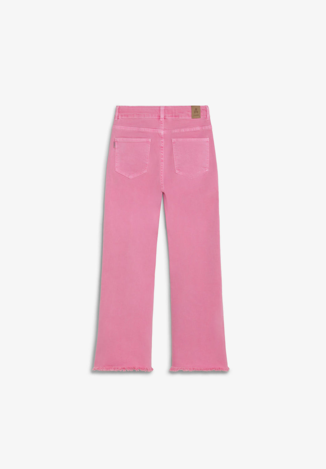 Flared trousers made of cotton. Front button and zip fastening. Belt loops at the waist. Patch pockets on front and back. Slightly flared leg from the knee. Frayed finish on the hems. Front seams. Tonal embroidered detail on left front pocket.