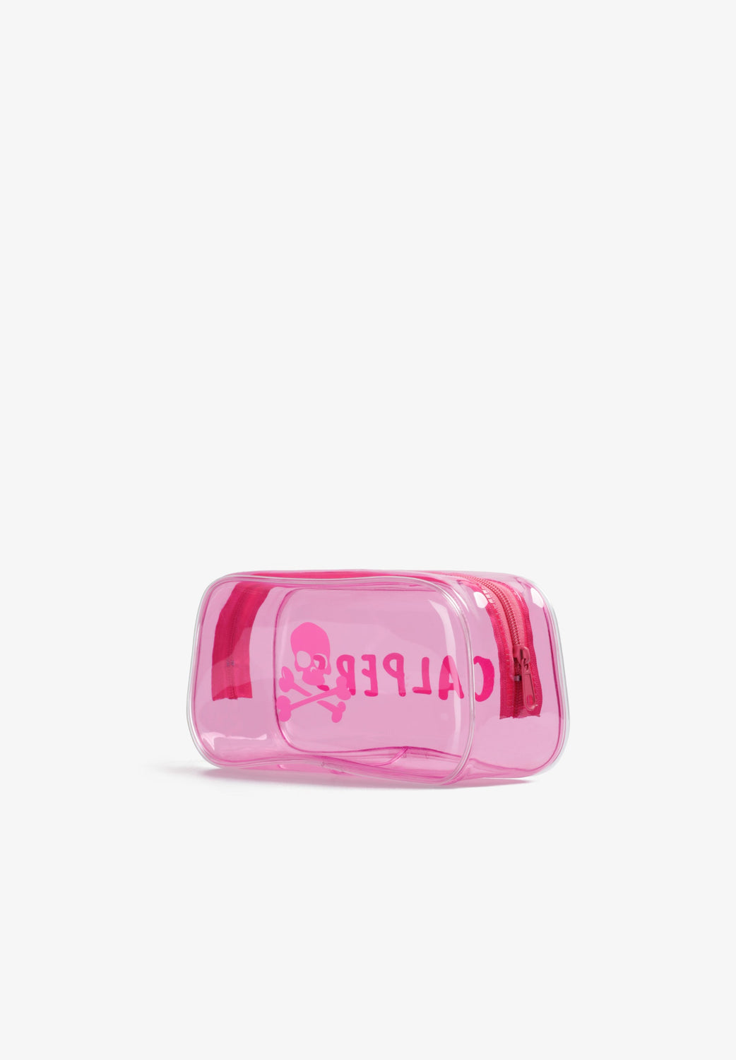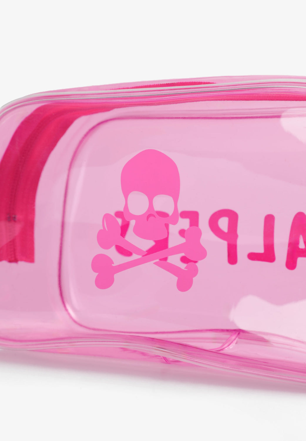 Transparent toiletry bag with zip fastening. Side print with skull and logo. Includes transparent bottles for liquids.