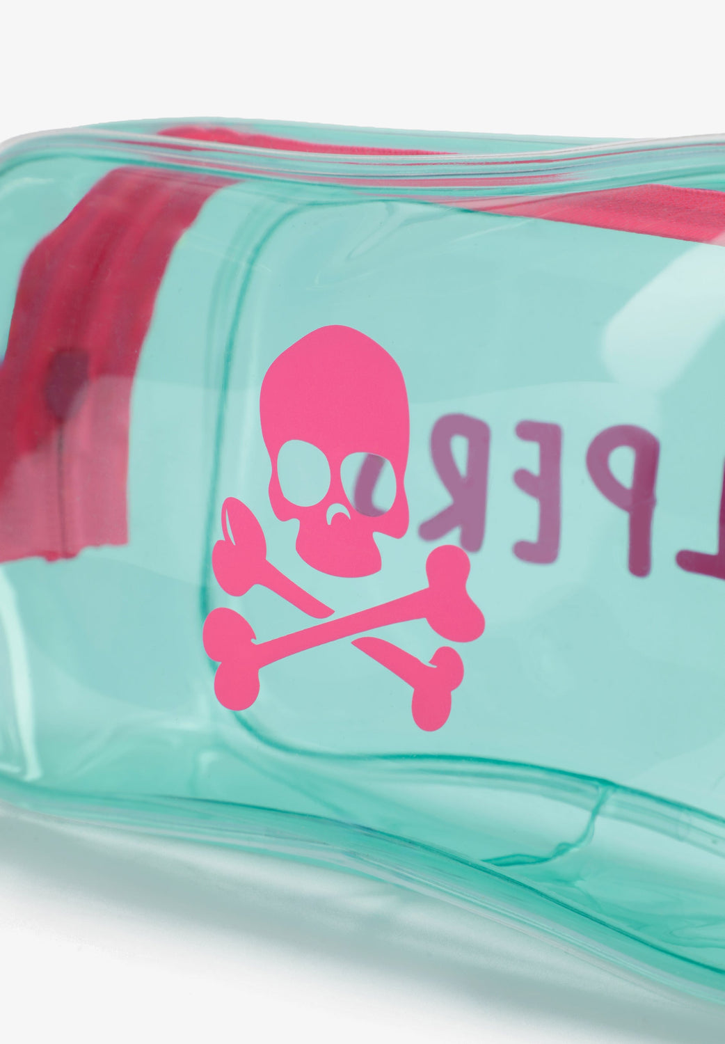 Transparent toiletry bag with zip fastening. Side print with skull and logo. Includes transparent bottles for liquids.