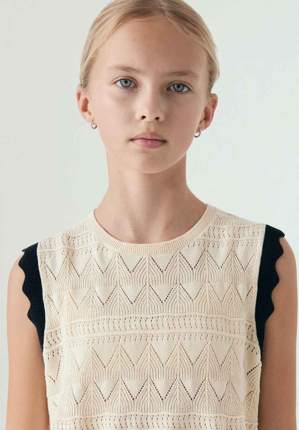 Top made of 100% cotton fabric. Sleeveless design with round neck and openwork knit. Contrast scalloped detailing on armholes and hem.