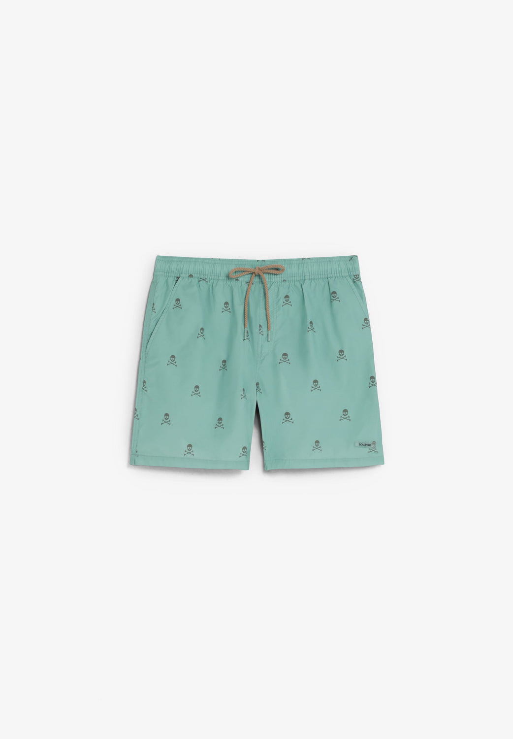 Swimming trunks with elasticated waistband and drawstring. Side pockets. Contrast skull print. Back pocket.
