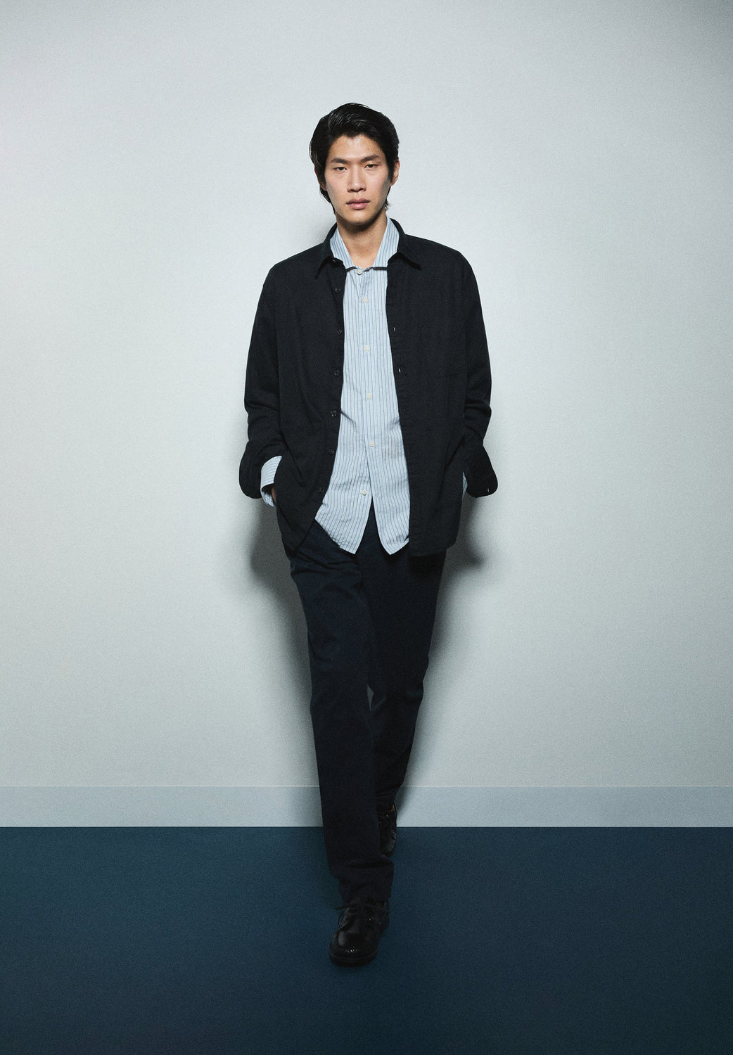 Polo shirt style cardigan made of cotton and silk fine knit blend. Polo shirt collar and long sleeves. Front button fastening.