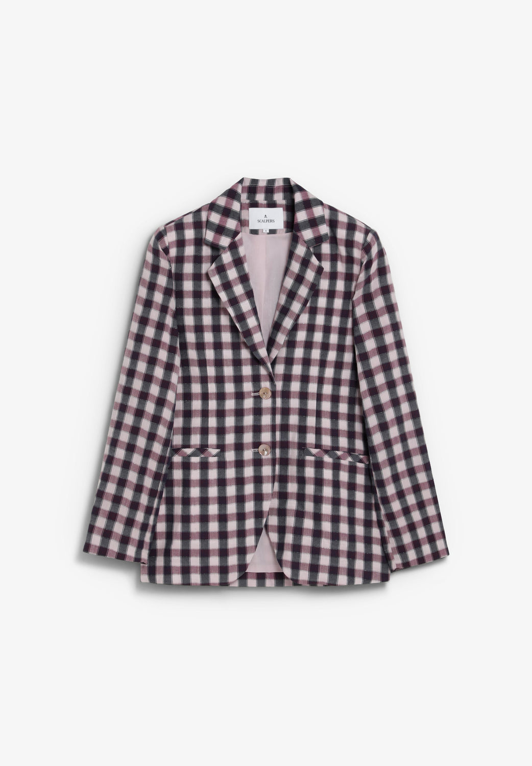 Blazer made of flowing fabric with metallic thread Slim fit. Gingham print. Classic lapel collar and long sleeves with buttoned cuffs. Welt pocket on front. Lined. Front button fastening.
