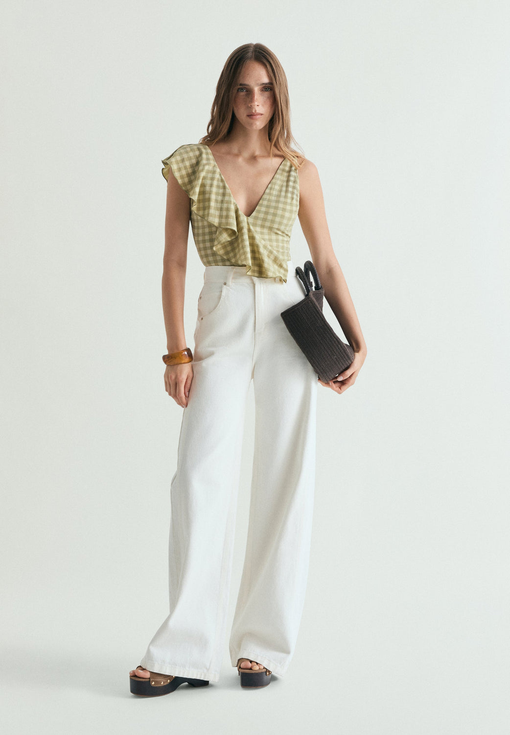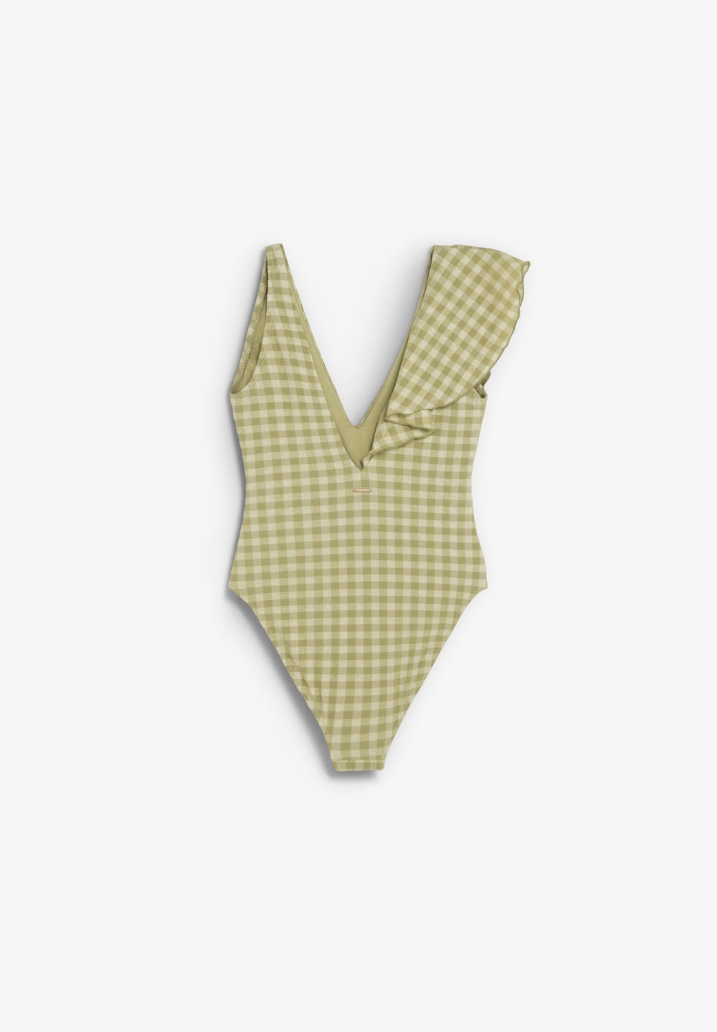 Swimsuit made of elastic fabric with metallic thread on the yoke and gingham print. Lined. V-neck and diagonal ruffle on the front. Back V-neck.
