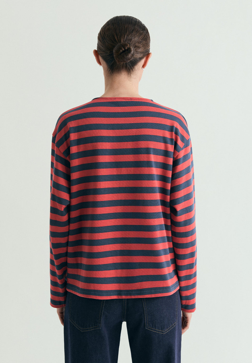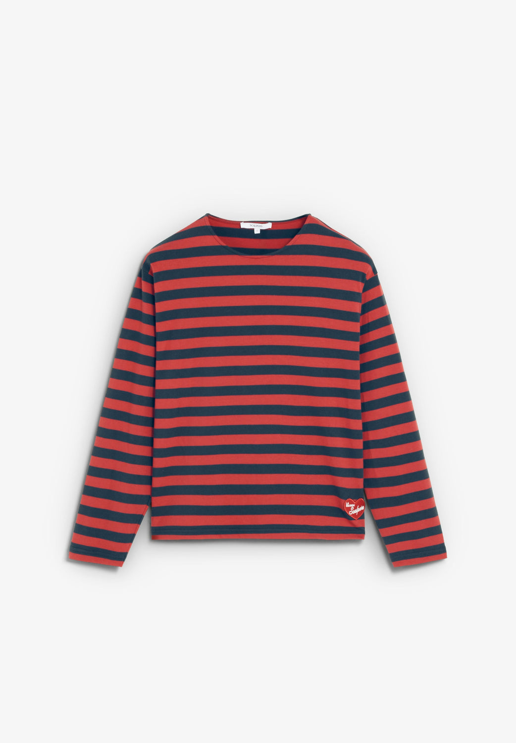 Striped T-shirt made of 100% BCI cotton. Regular fit, round neck and long sleeves. Logo patch detail on the front hem.