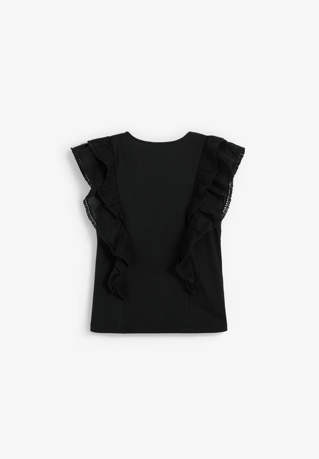 T-shirt made of 100% cotton. Relaxed fit. Round neck and sleeveless design. Ruffles with decorative lace.