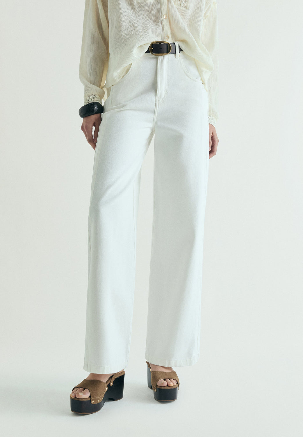 Denim broek gemaakt van 100% BCI-katoen. Regular fit, recht model. Hoge taille met rits- en knoopsluiting. Riemlussen op de tailleband. Voor- en achterzakken.