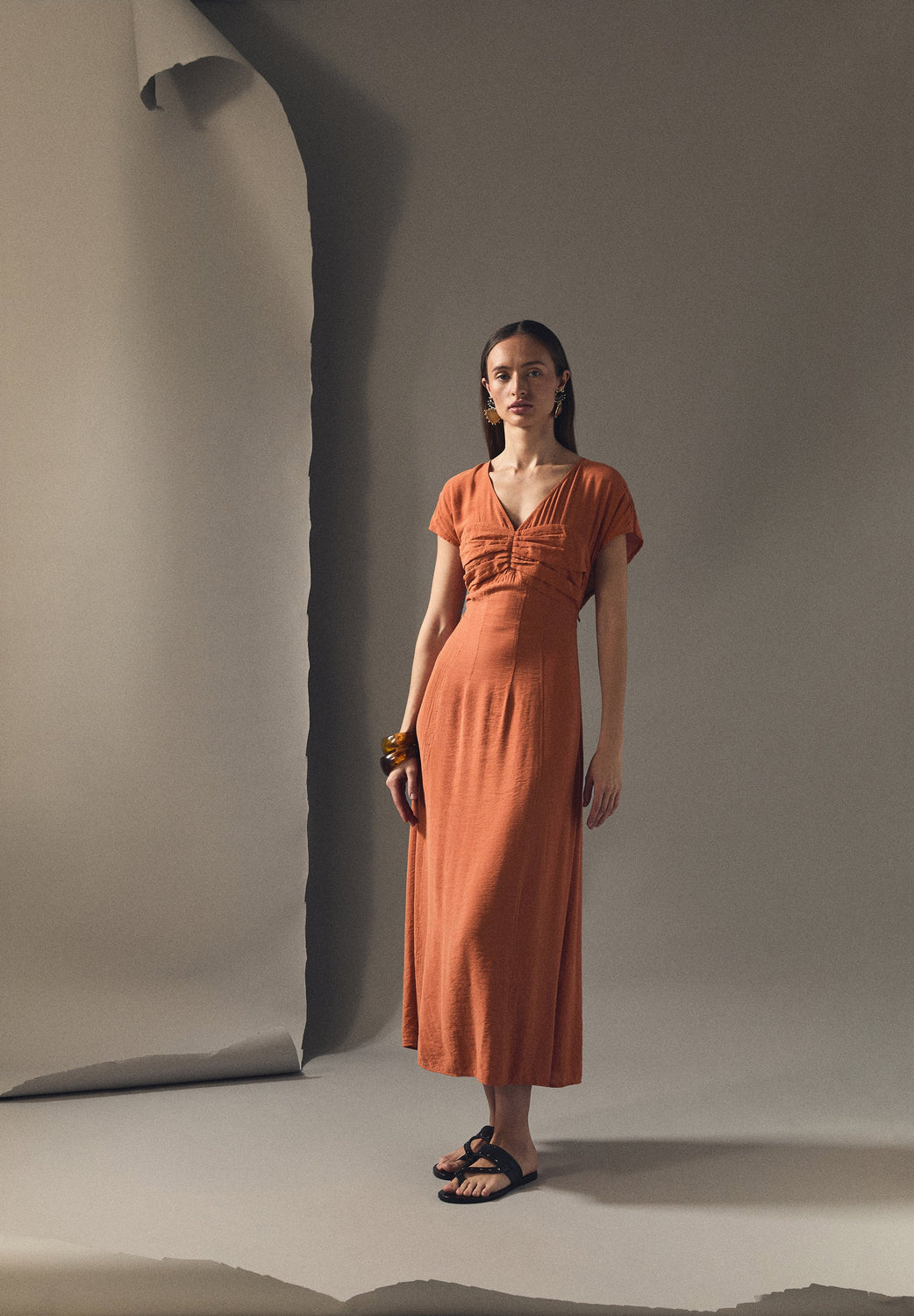 Bustier dress made of slightly stretchy cotton. Slim fit, V-neck. Pleated detail on the chest. Short sleeve. Midi length. Concealed side zip fastening.
