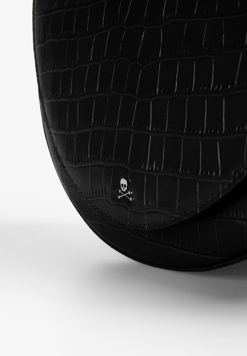 Bag made of 100% leather. Embossed finish. Split suede lining. Double strap. Inner zipped compartment. Metal skull on flap with magnetic button closure.