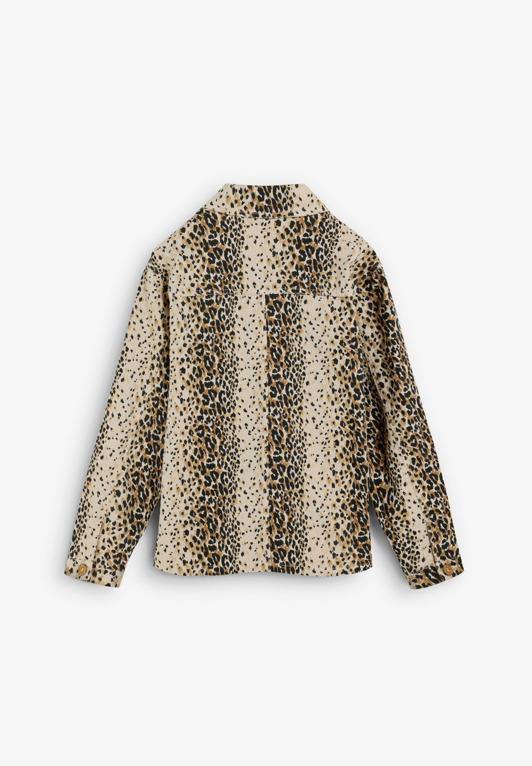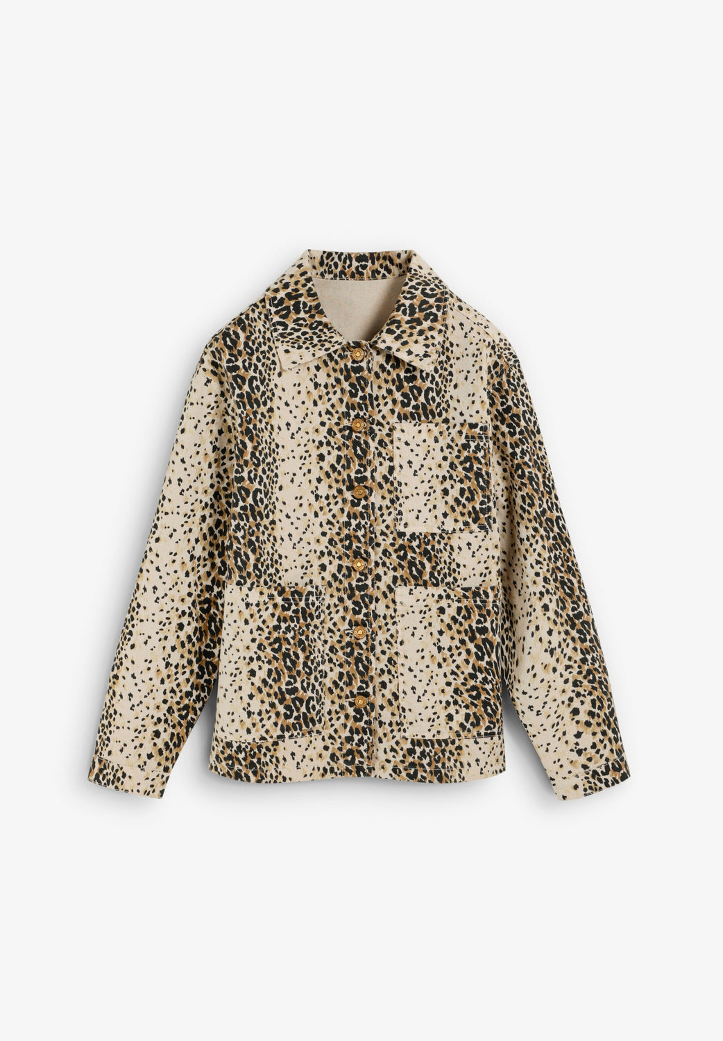 Classic collar and long sleeves. Front button fastening. Animal print in shades of beige, black and brown. Patch pocket detail at the front.