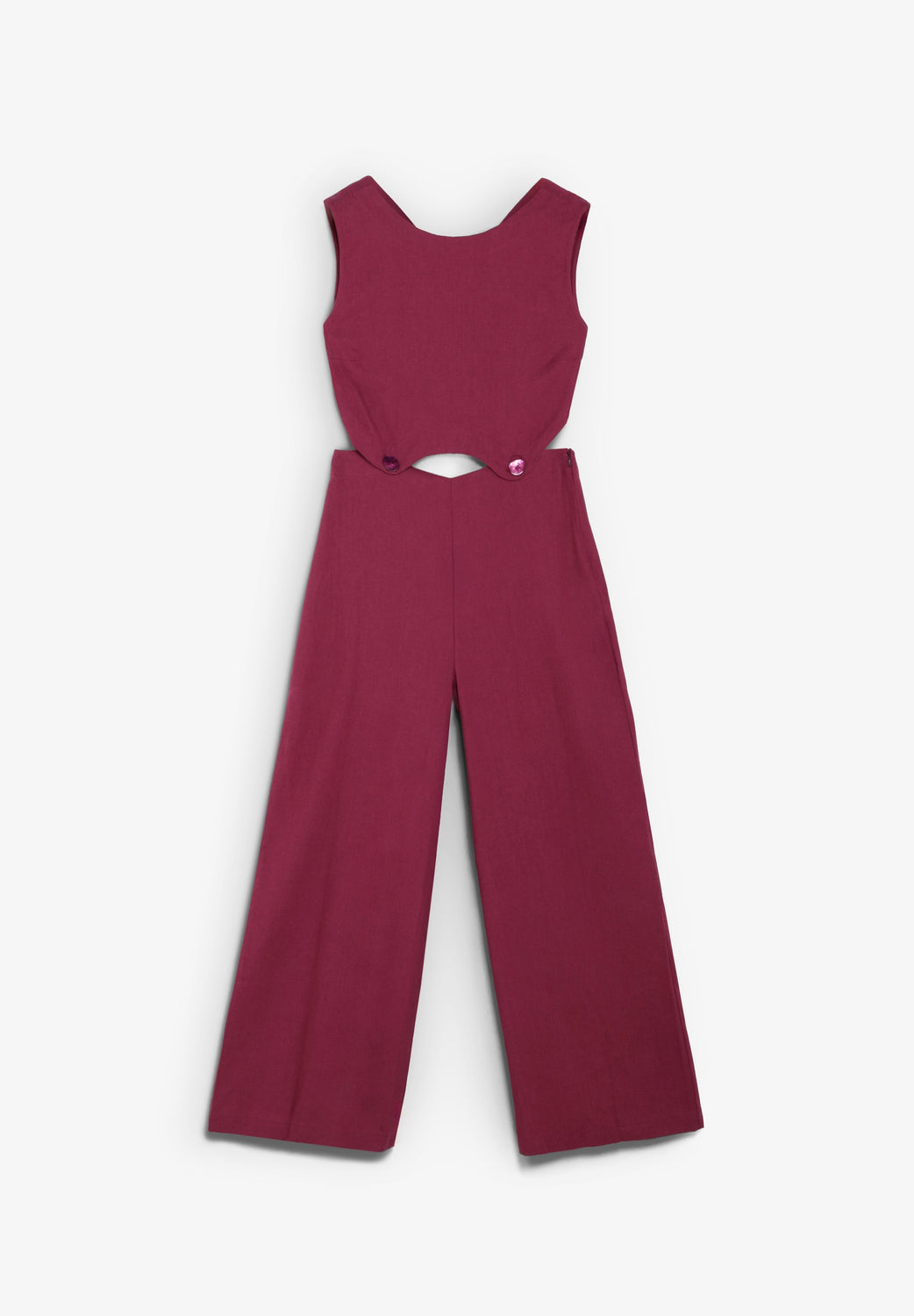 Linen jumpsuit. Regular fit. Round neck and sleeveless design. Cut-out details on the waistband, joined to the trousers with tonal buttons. V-back and button fastening.