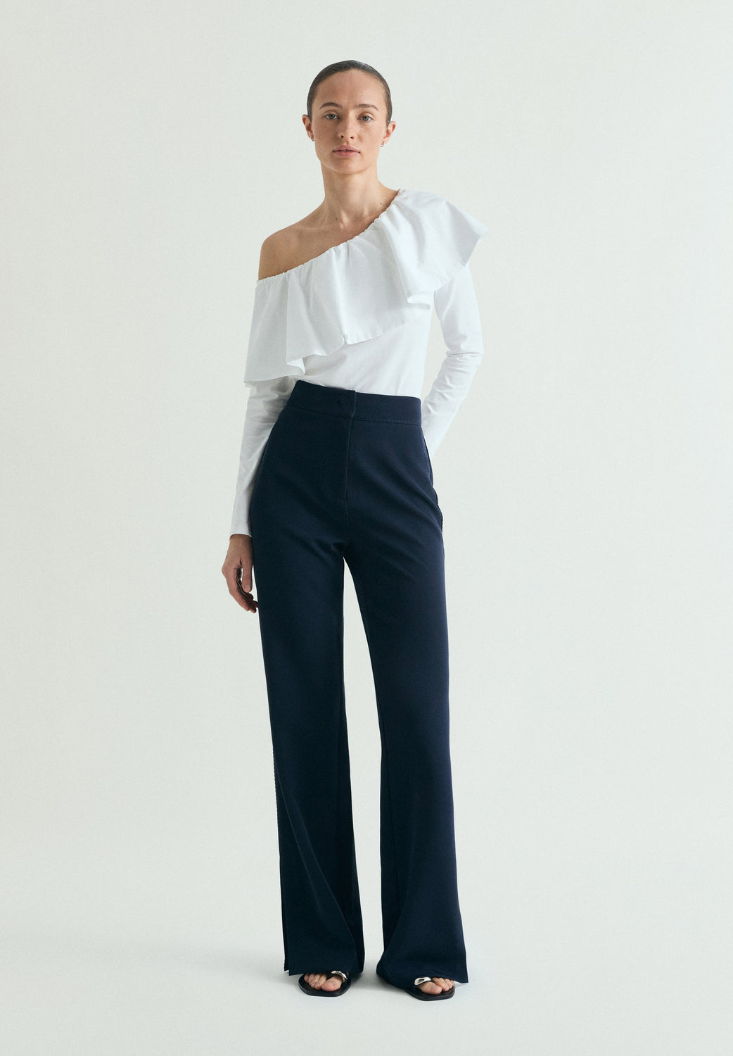 Top made of a cotton blend. Asymmetric neckline with ruffle and long sleeves.