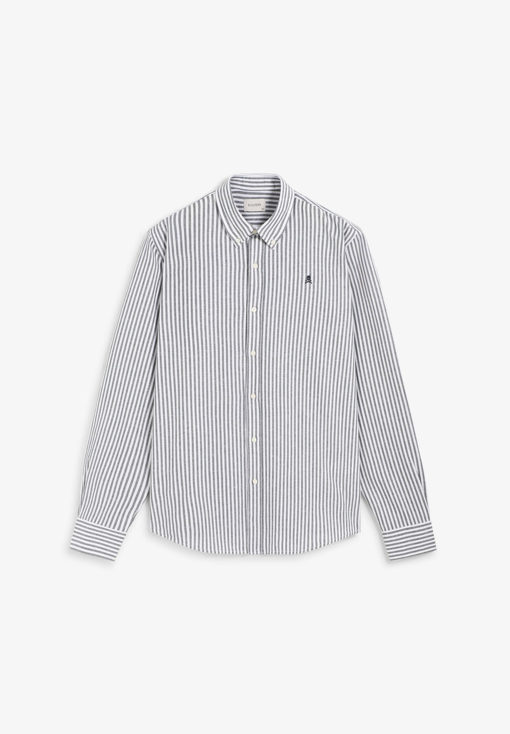 Oxford shirt made of a cotton and linen blend. Stripe print. Front button fastening. Contrast embroidered skull on the chest.
